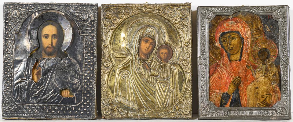 Two depictions of Mary with the Infant Jesus, one Christ Pantocrator. Each with traces of age.