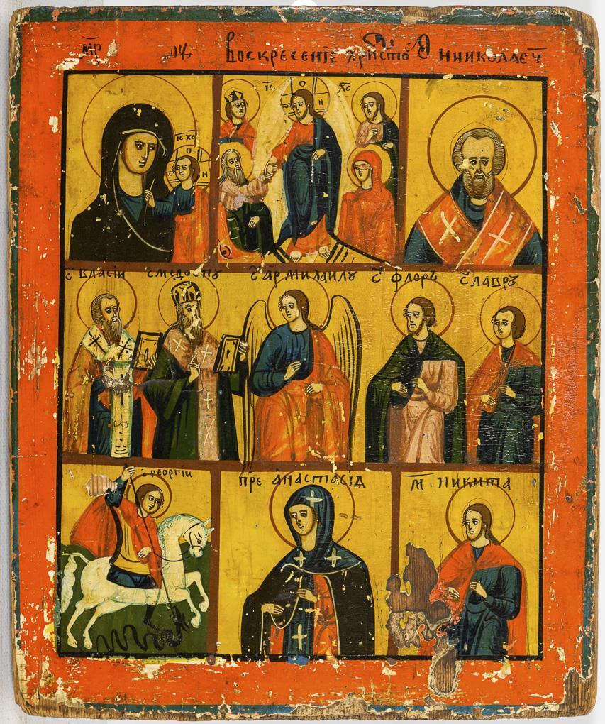 Several scenes with Mary and Jesus as well as St. George as a dragon tiger. Missing parts.