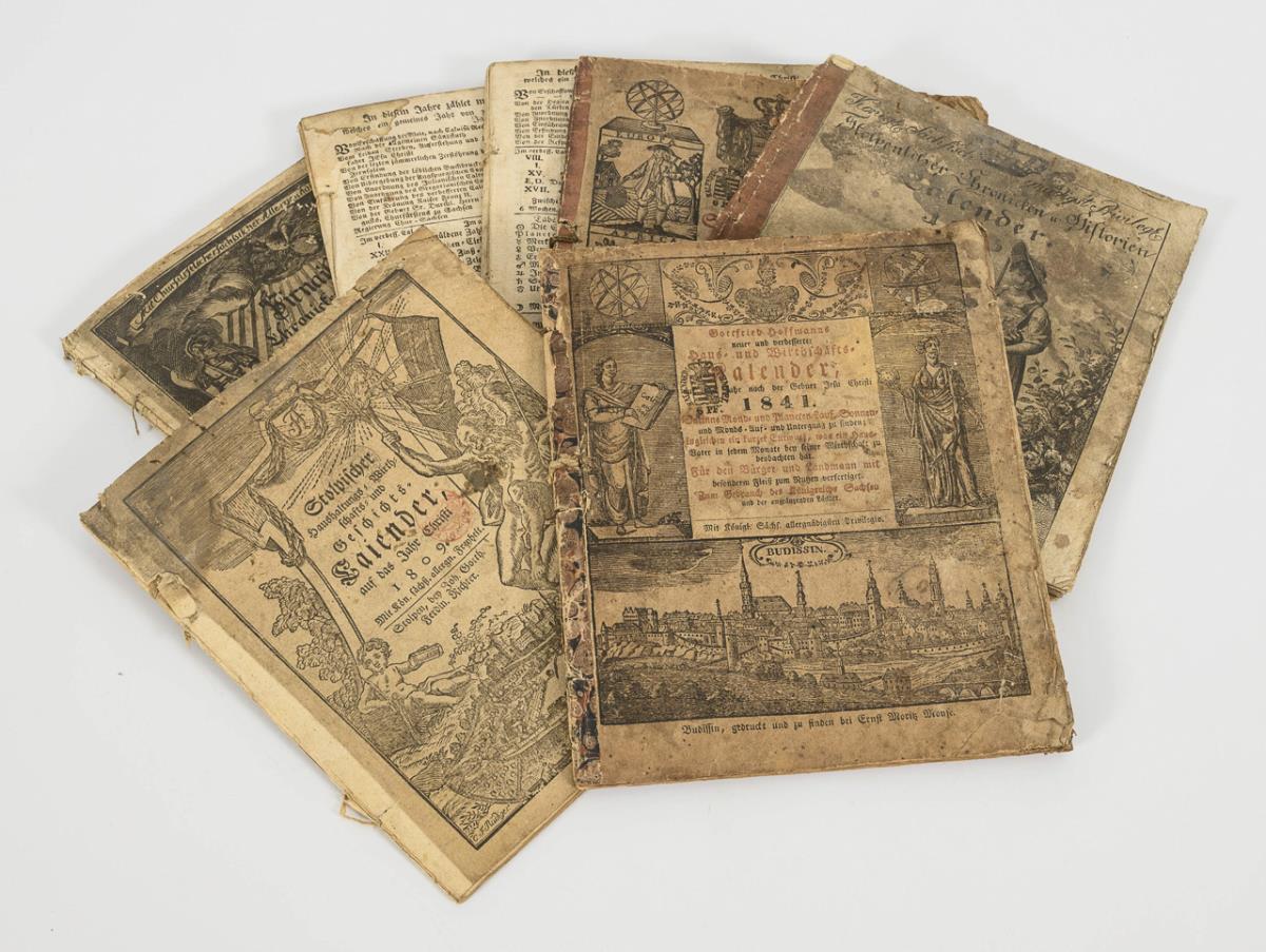 "Pirnaischer Chronicken-und Historien Calender" 1800 / 2 fragments 1805 and 1812 / "Stolpischer Haushaltungs- Wirthschafts- und Geschichtskalender" 1809 / "Budissiner historischer Schreibkalender" 1839, with "6 Pfennig Kalenderstempel" and for 1817, 1857, 1873, 1874 / "Gottfried Hoffmanns ... Haus- und Wirthschaftskalender" Budissin 1841 / "Pirnaischer Oeconom Haushaltungskalender 1863" / "Stolpenscher Chronicken und Historien Calender" 1813 / "Meissner gemeinnütziger und unterhaltender Calender" 1859. In modern fan folder. All with strong signs of use.