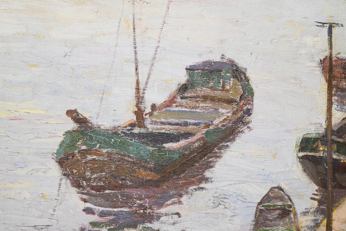 Ships in the harbor by the river on a bright day with a view of the old town.