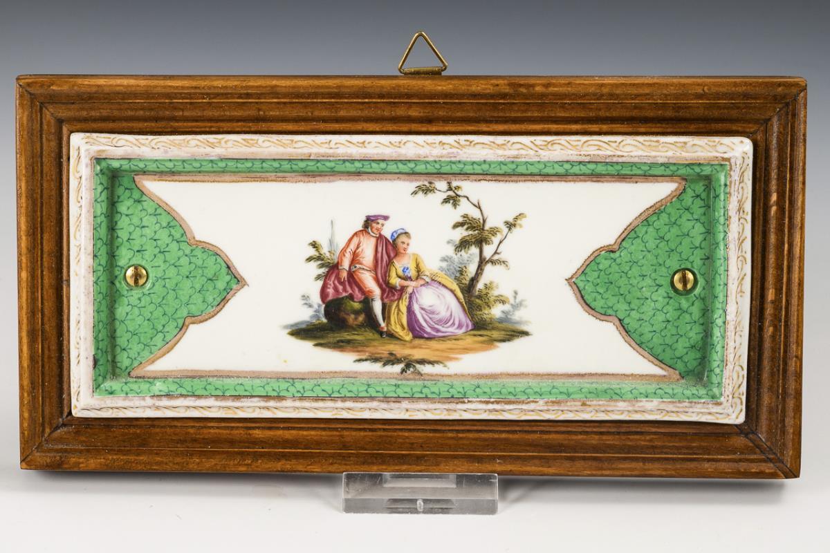 Rectangular plate with green scale border and Watteau painting in the mirror. Gold somewhat rubbed.