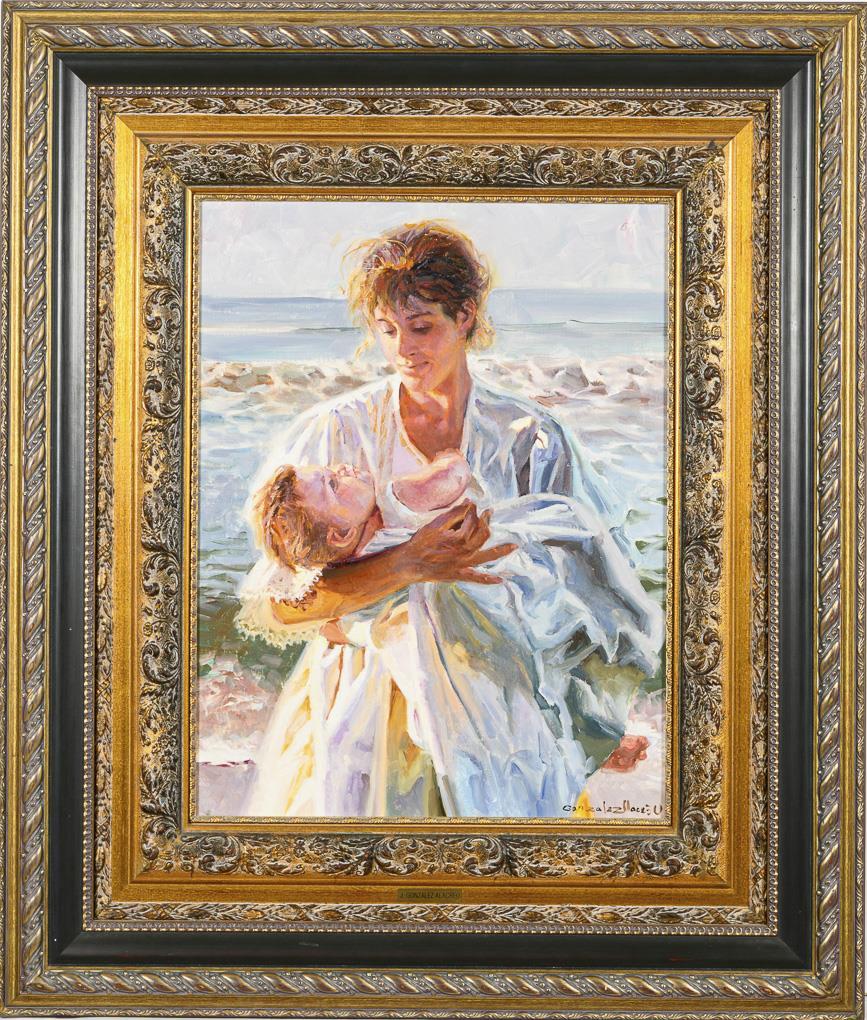 The blissfully gazing mother with the child in her arms before the waves of the sea in atmospheric light.
