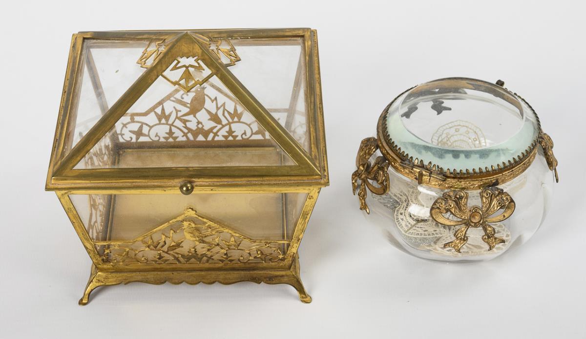 Glass box with pyramid roof marked Erhard & Söhne, rosewood box with indistinctly marked key.