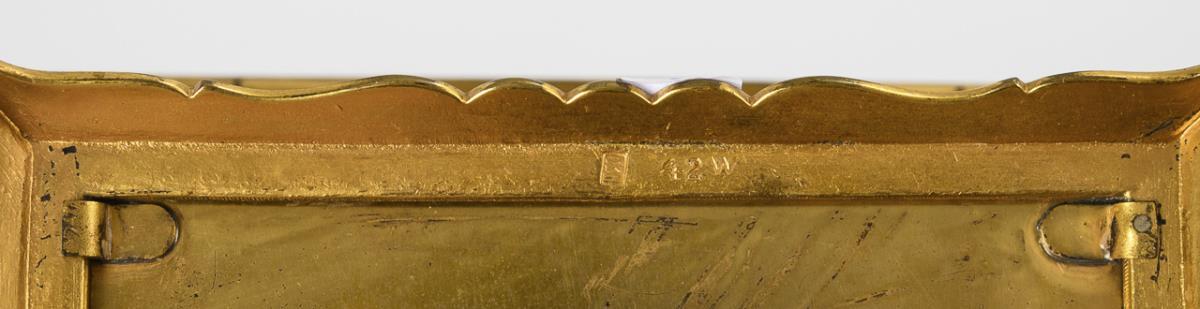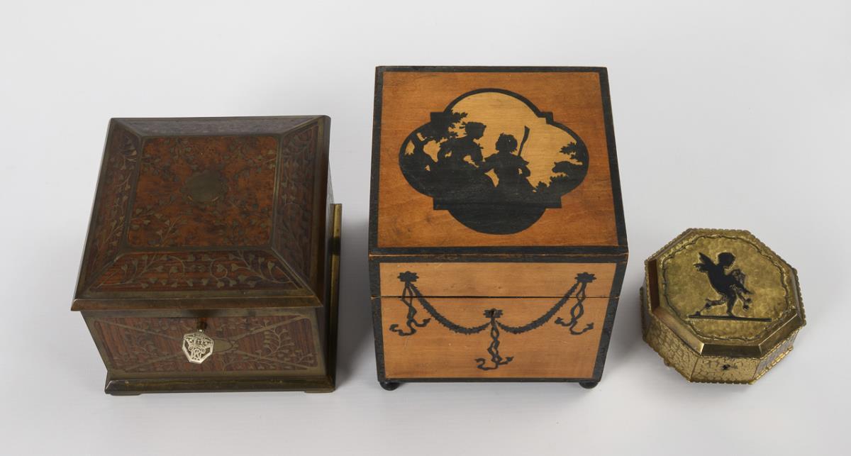 Birch partly ebonized, brass marquetry, partly black lacquered appliqués, rosewood with brass inlays, glass with brass, burl wood with appliqués. Maximum size 9 x 25 x 15 cm.