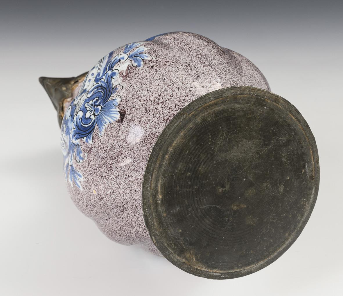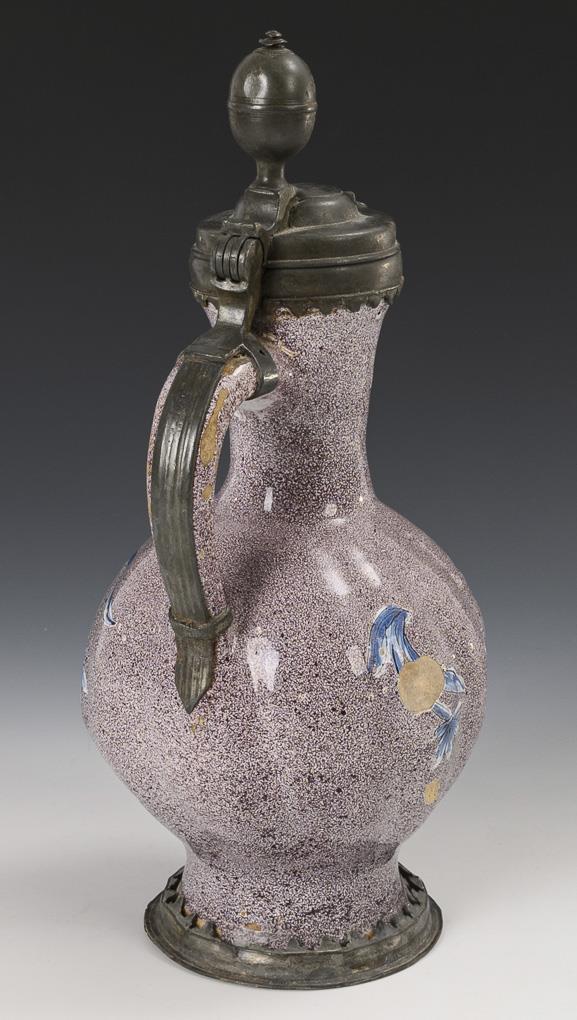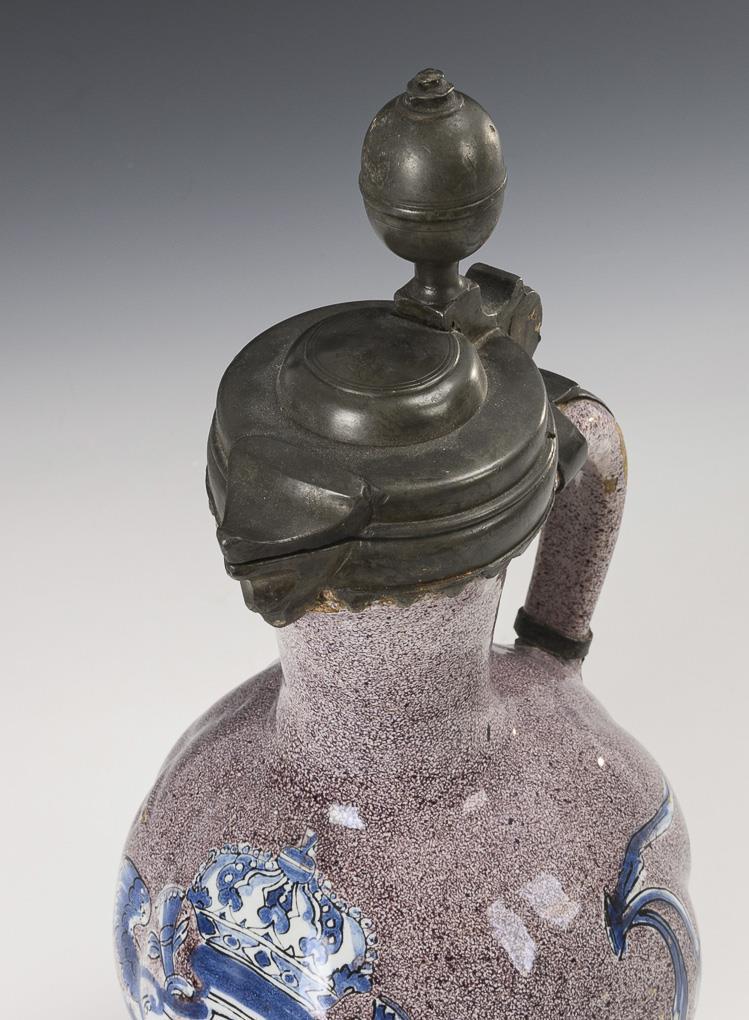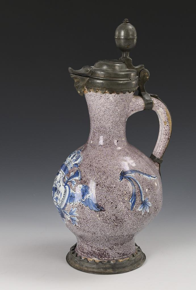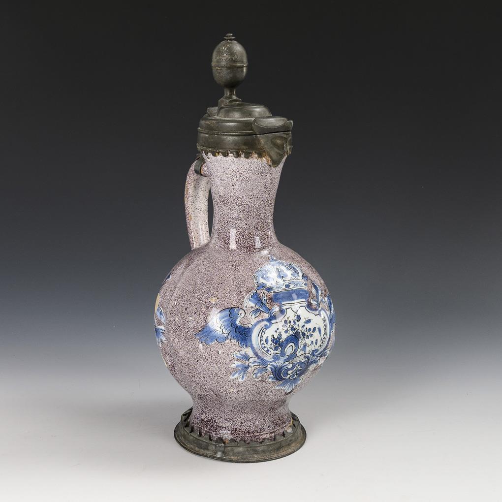 Globular bellied jug with grodroned wall and ribbon handle, on the front a crowned and winged rocaille reserve with fine floral painting, flanked by baroque flowers. Original pewter mount, lid with ball finial, hallmarked inside, pewter stand with battlement border. Glaze with chips and rubbing, inside of mouth with fine crack, pewter with signs of age and defects.
