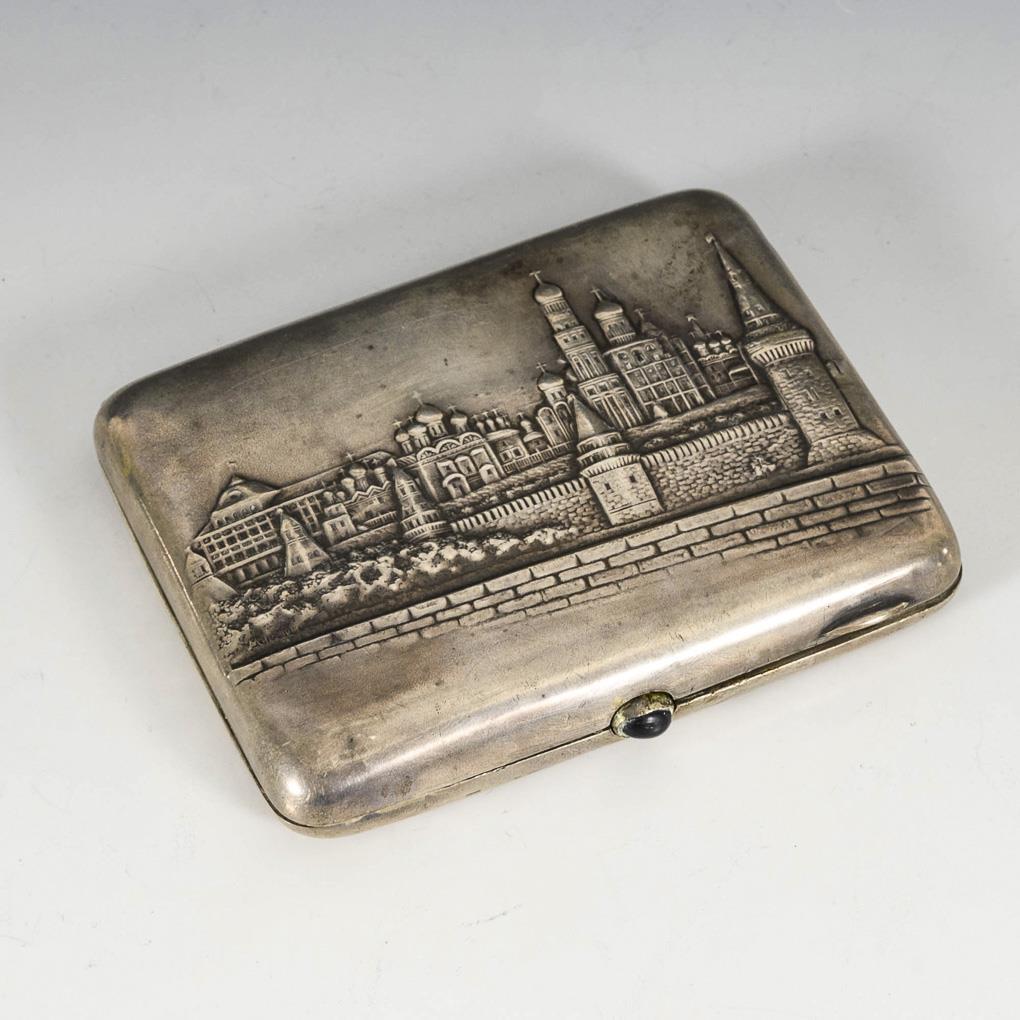 Silver case with relief depiction of the Moscow Kremlin. Signs of wear, small dents, clasp with repair.
