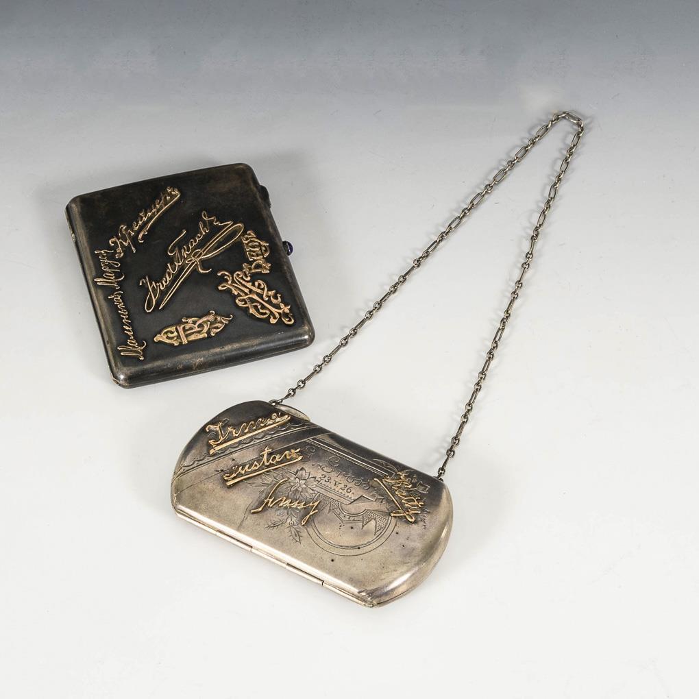 Silver case with applied Cyrillic lettering in gold and blue oval cabochon (Kokoshnik mark, Moscow 1908-1926, 8.5 x 10.5 cm, 174 g). / Small silver case with applied gold lettering and engraving, on a short chain (Kokoshnik mark 1896-1908 and hallmark Latvia 875, 6 x 10.5 cm, 99 g). Small case slightly dented, 1 letter and 1 lettering missing.