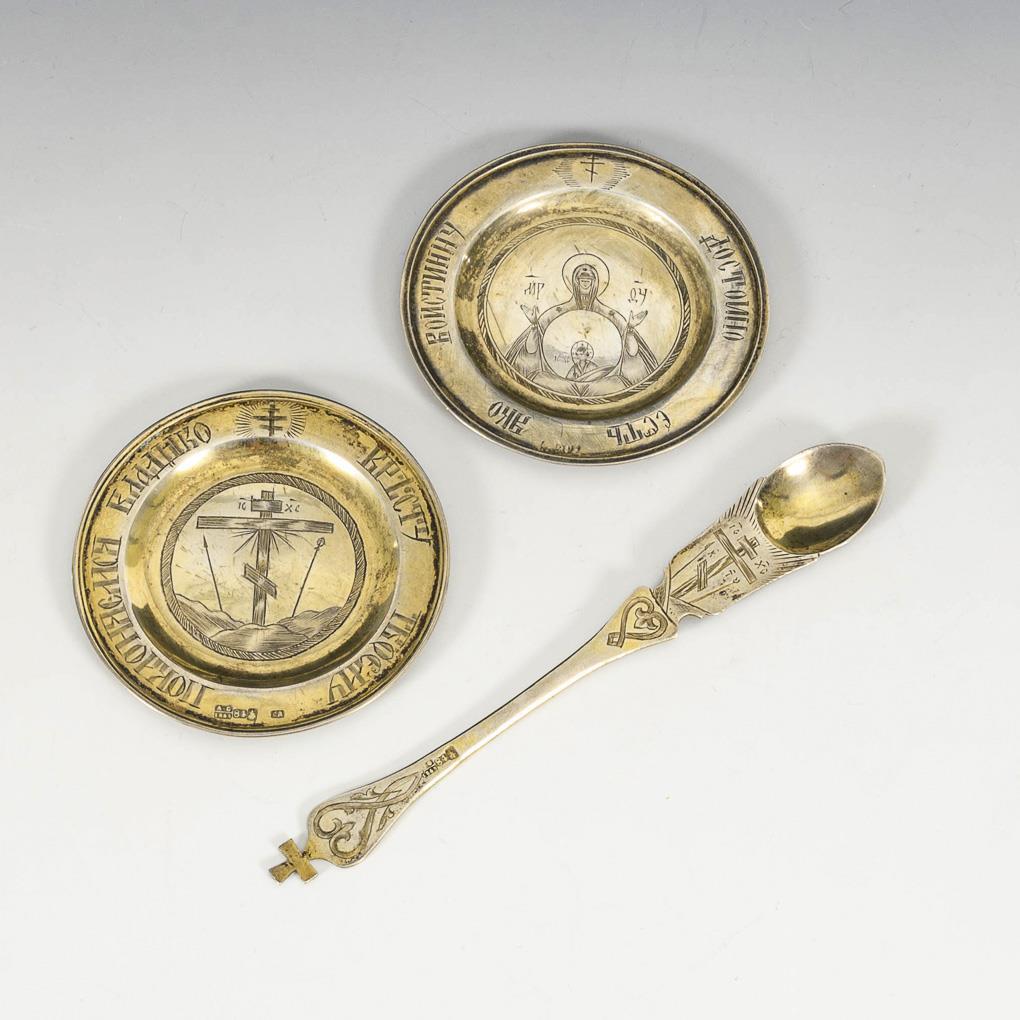 Liturgical utensils: 2 small plates and a spoon with Christian motifs and Cyrillic engravings. Gold partially rubbed, minimally dented.