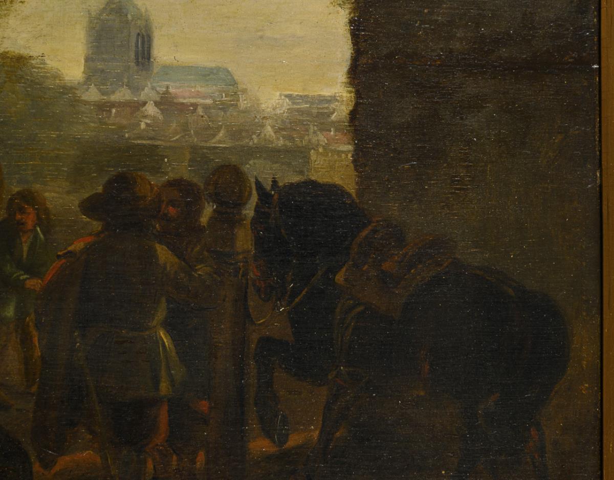 Two men taming the white horse in the courtyard, next to them other Landsknechte in front of a view of the town with a church on the horizon. Traces of age.