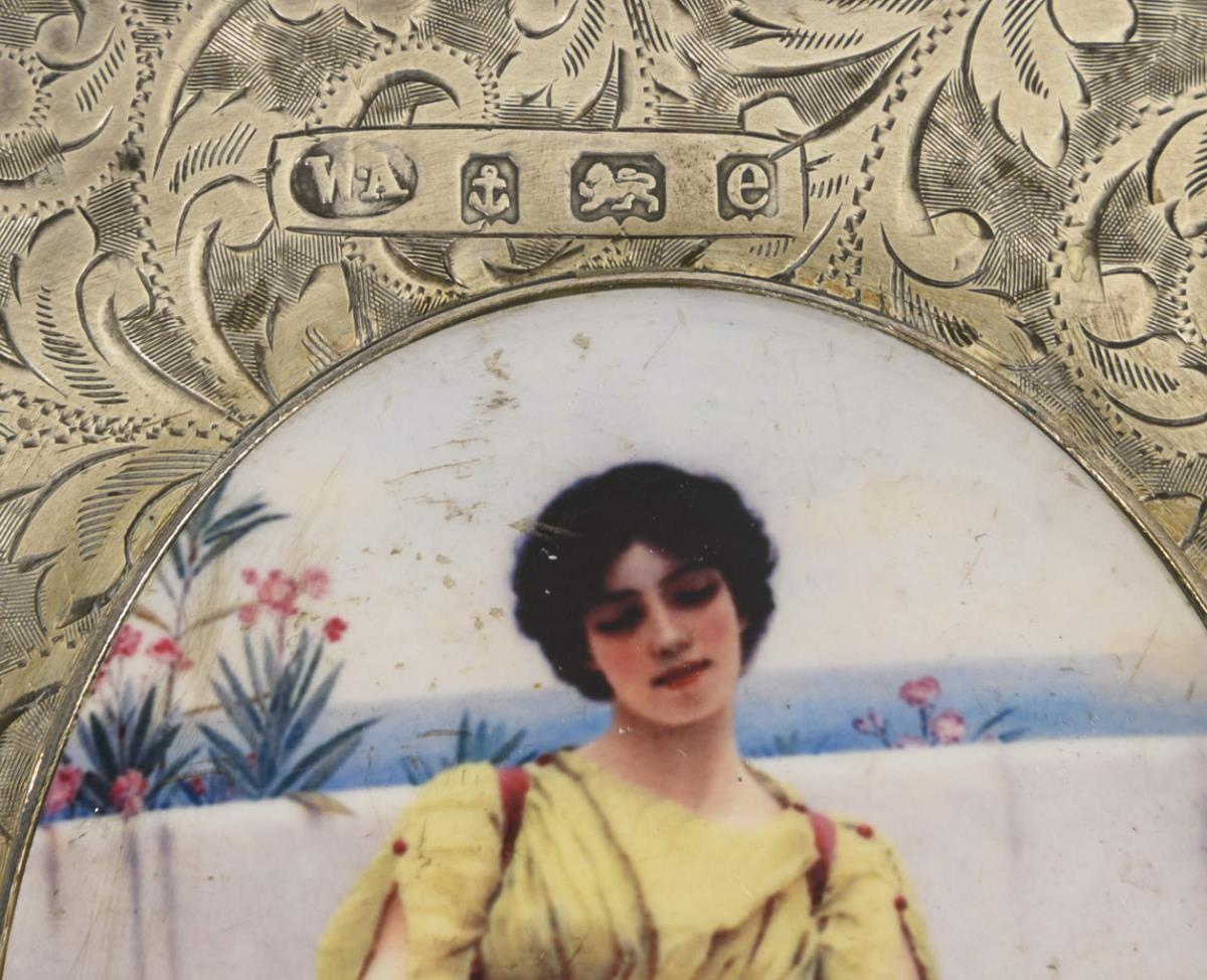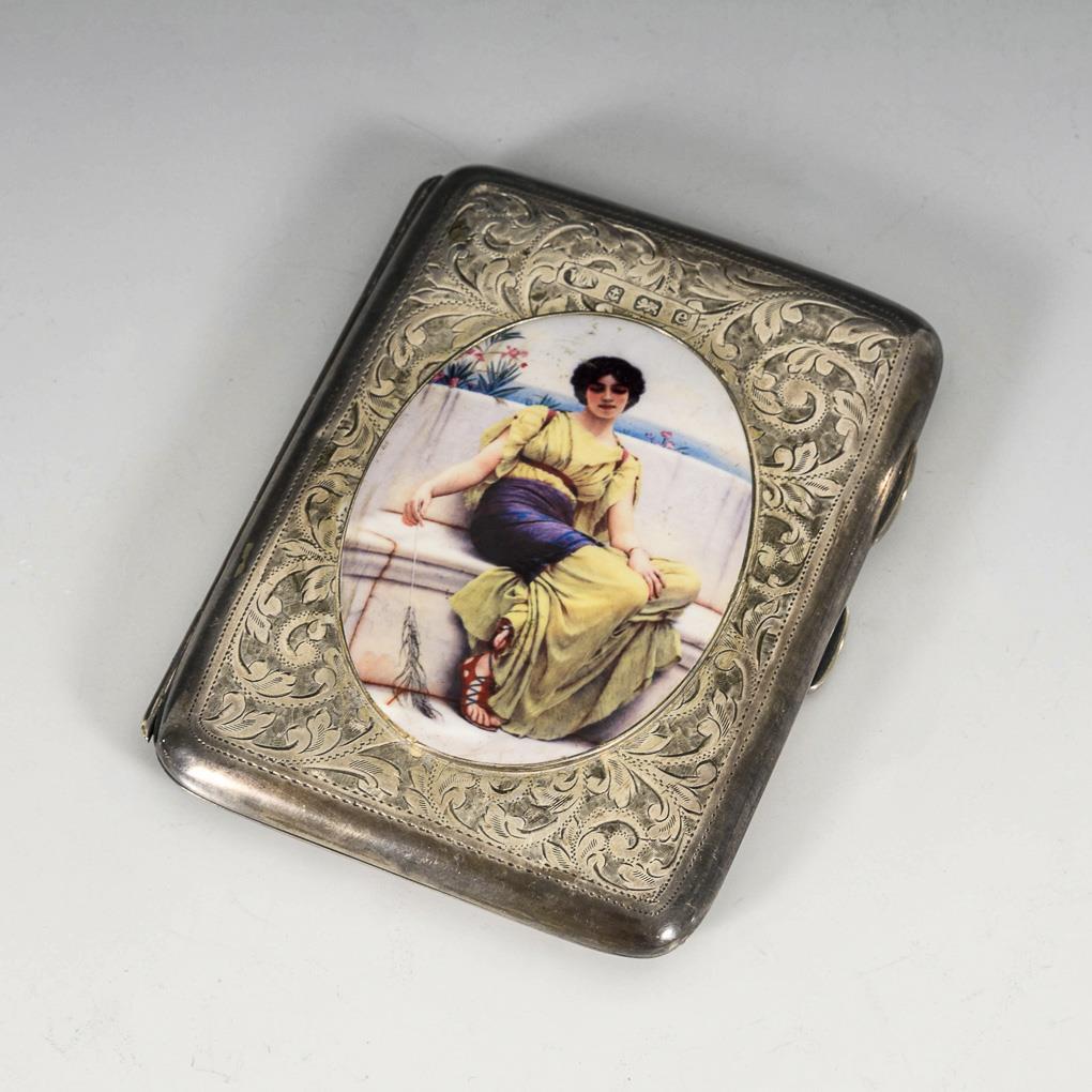 Business card case with fine vine engravings. On the hinged lid an oval enamel picture depicting a young woman in antique costume. Inside blue compartments. Signs of wear, small scratches in the picture.