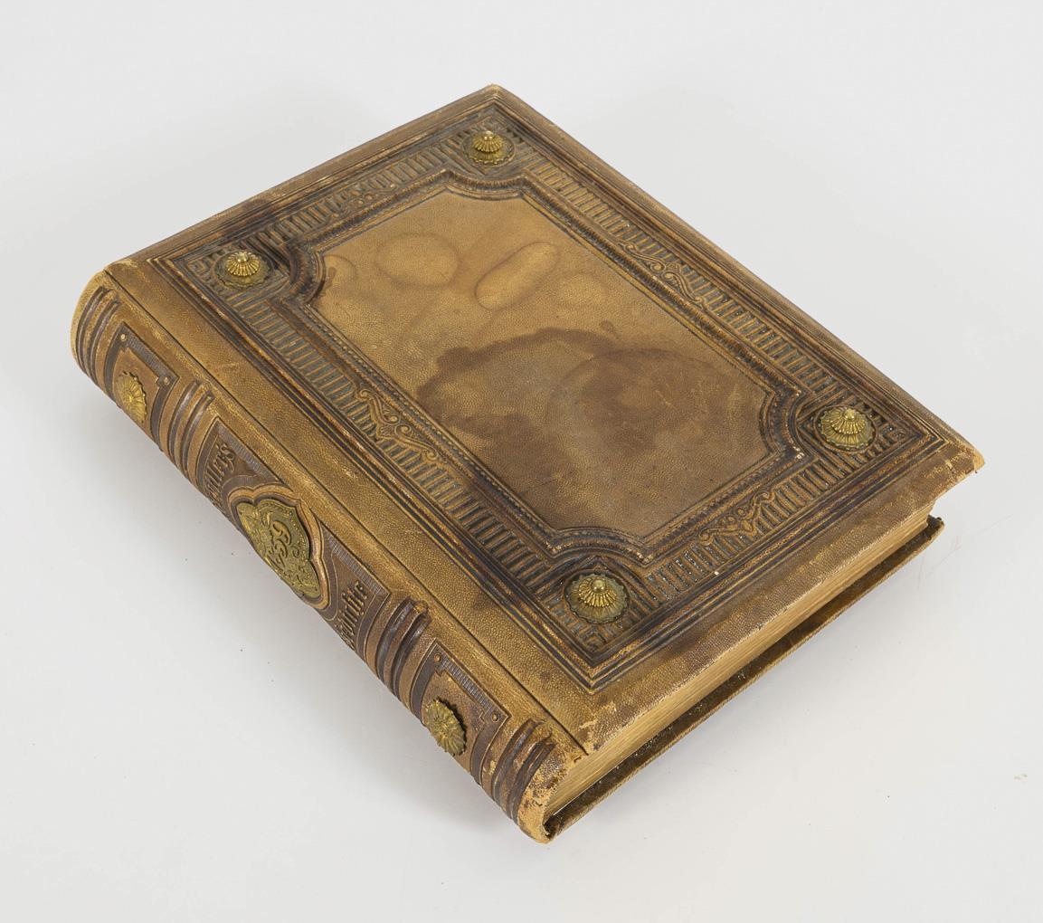 Embossed leather binding with metal applications, gilt edges. 565 pages. Paste-downs from the dedication page on the endpapers, stained binding, block slightly foxed.