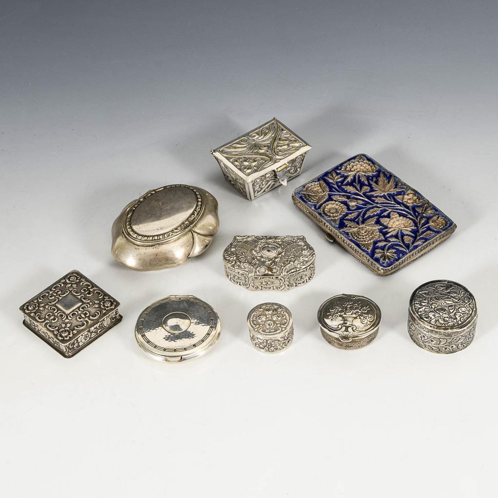 4 silver pill boxes (hallmarked) and 5 different boxes made of other metals (partly silver-plated). Including 1 small spoon. Signs of wear, partly rubbed.