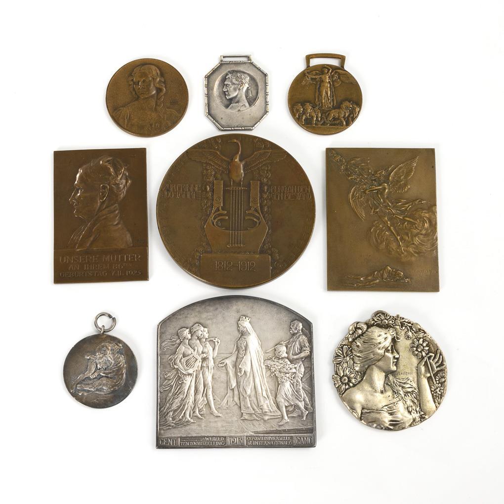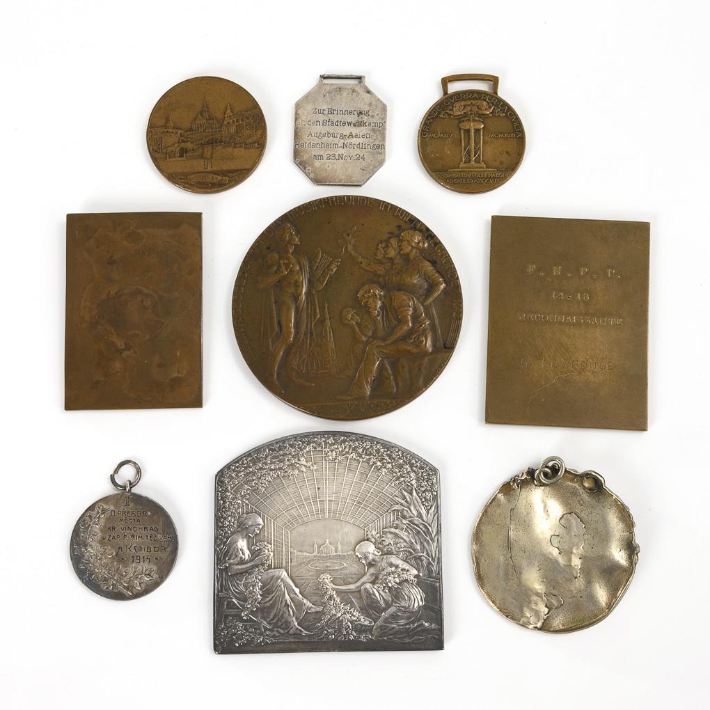 G. Devreese inscribed round plaque in relief on both sides for the 1913 World Exhibition in Ghent / Hans Schaefer and H. Hartig inscribed round plaque in relief on both sides for the "K. K.. Gesellschaft der Musikfreunde in Wien" on the occasion of its 100th anniversary in 1912 / De Kerckhove inscribed "F.N.P.P." plaque in relief on the obverse Reconnaissante 1914-18" for G. Delronge / Josef Tautenhayn inscribed plaque "Unserer Mutter zum 86. Geburtstag" 1925 / Lasserre inscribed plaque in relief with a woman and flowers on the obverse with hanging loop. / Lajos Beran inscribed plaque with a portrait of a woman on the obverse, fine view of Budapest on the reverse / Sacchini-Milano inscribed plaque in relief on both sides with eyelet for World War I / Plaque in relief with Hercules on the obverse with eyelet; engraving with date 1914 on the reverse. / G.P. monogrammed 8-cornered plaque with hanging loop with crowned portrait, obverse engraving "zum "Städtewettkampf Augsburg-Aalen-Heidenheim-Nördlingen" 1924. Parts scratched.