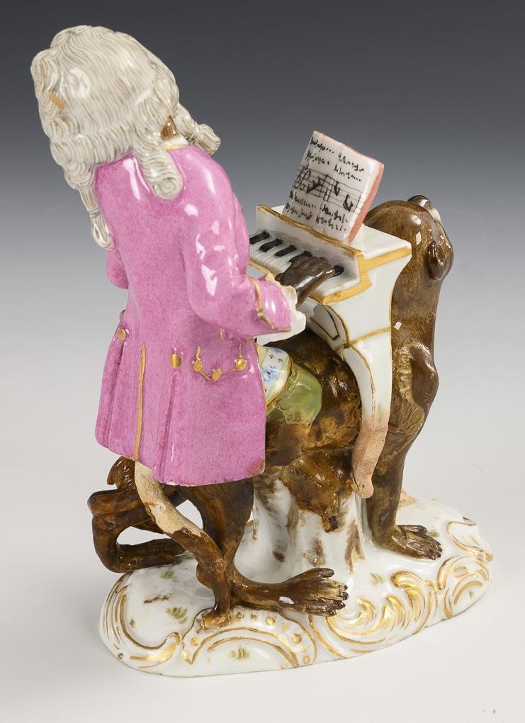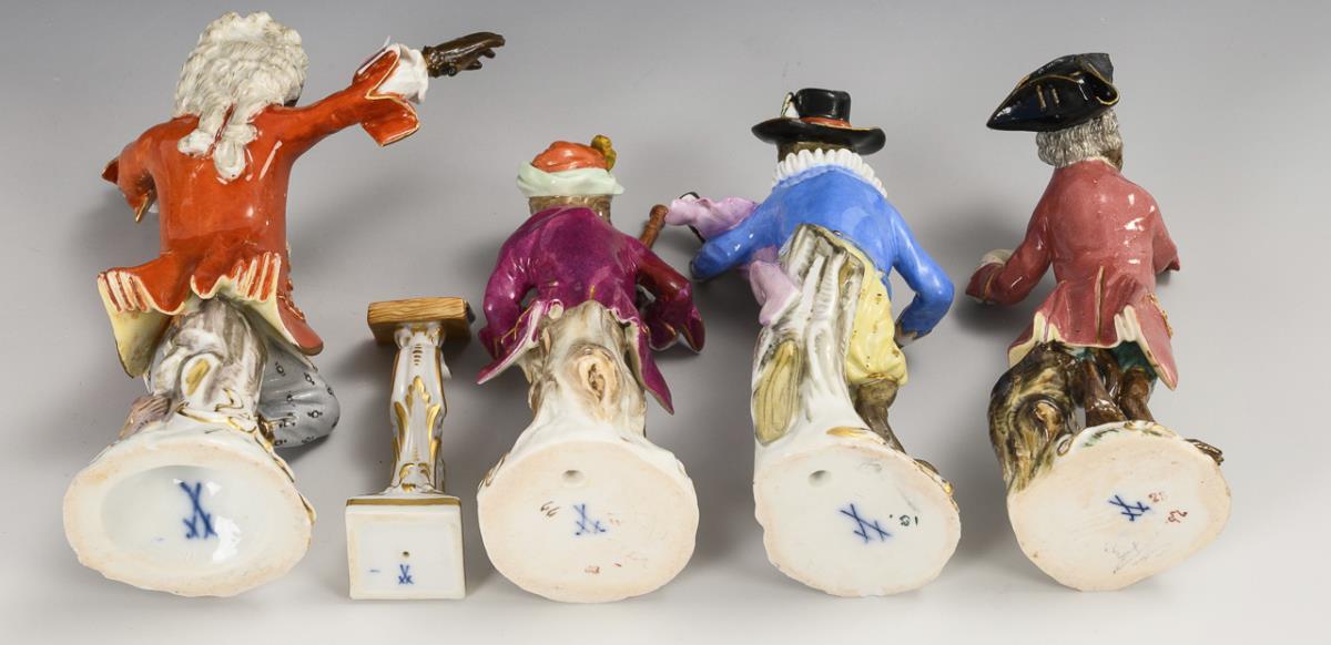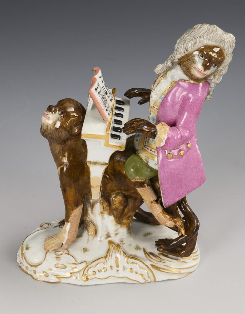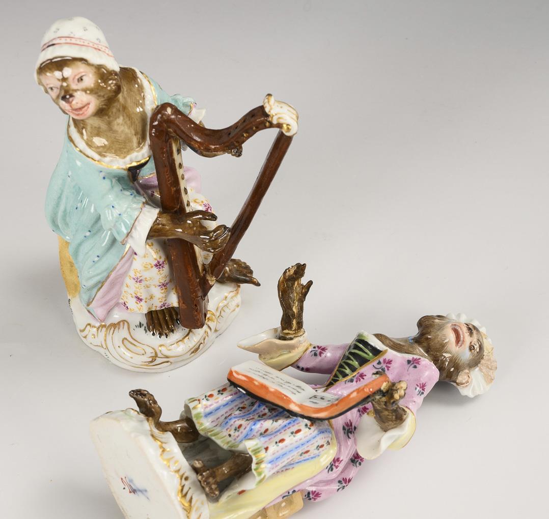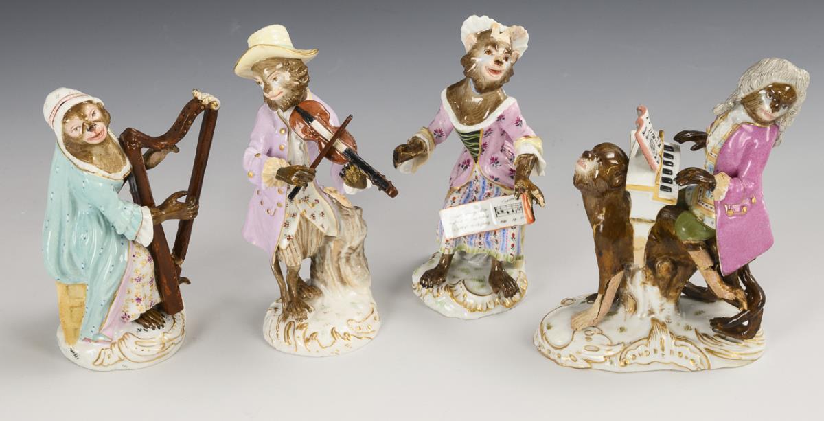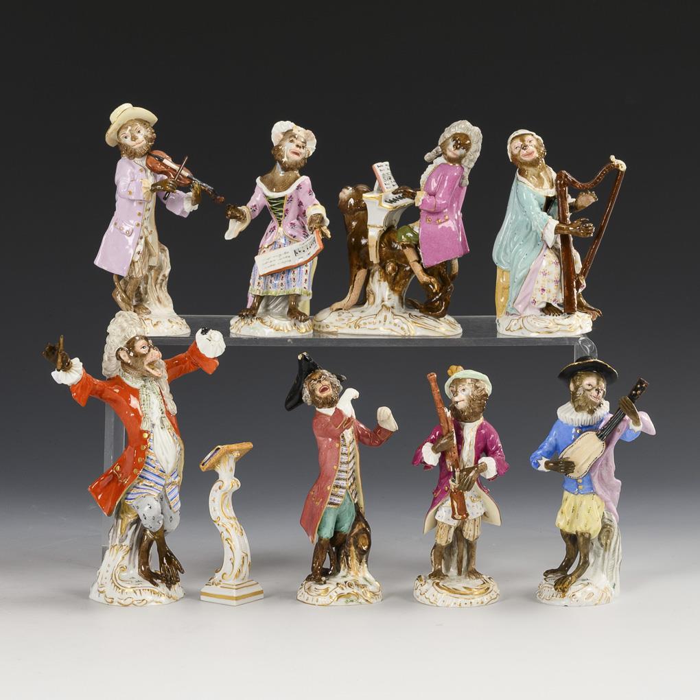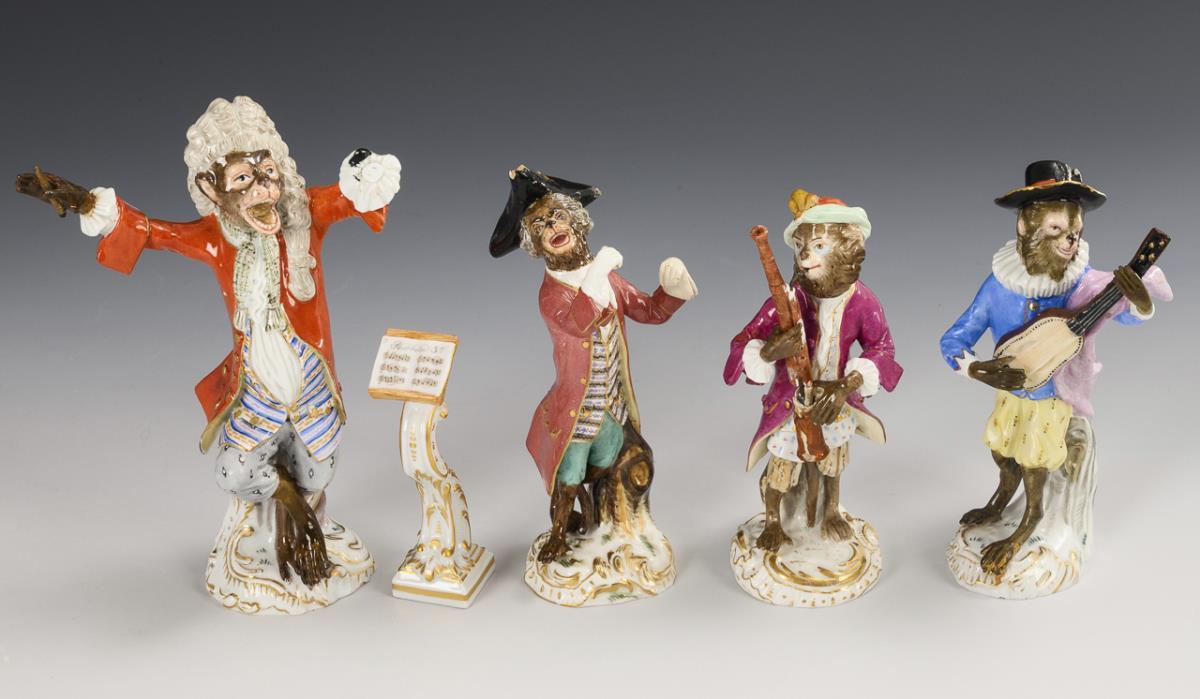 Monkey as conductor, bassoonist, triangle player, violinist, guitarist, harpist, singer and as music director, plus 1 music stand. Some defects and missing parts, some with visible and faulty old restorations.