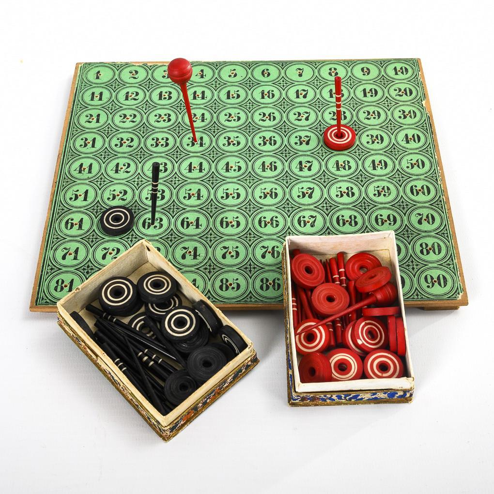 Lottery game with 2 game boards, wooden lottery pieces and further, beautifully colored pieces made of bone. Comes with the original lid of the original box and a copy of the original game instructions. 2 of 4 boards present, completeness of the other parts not checked.