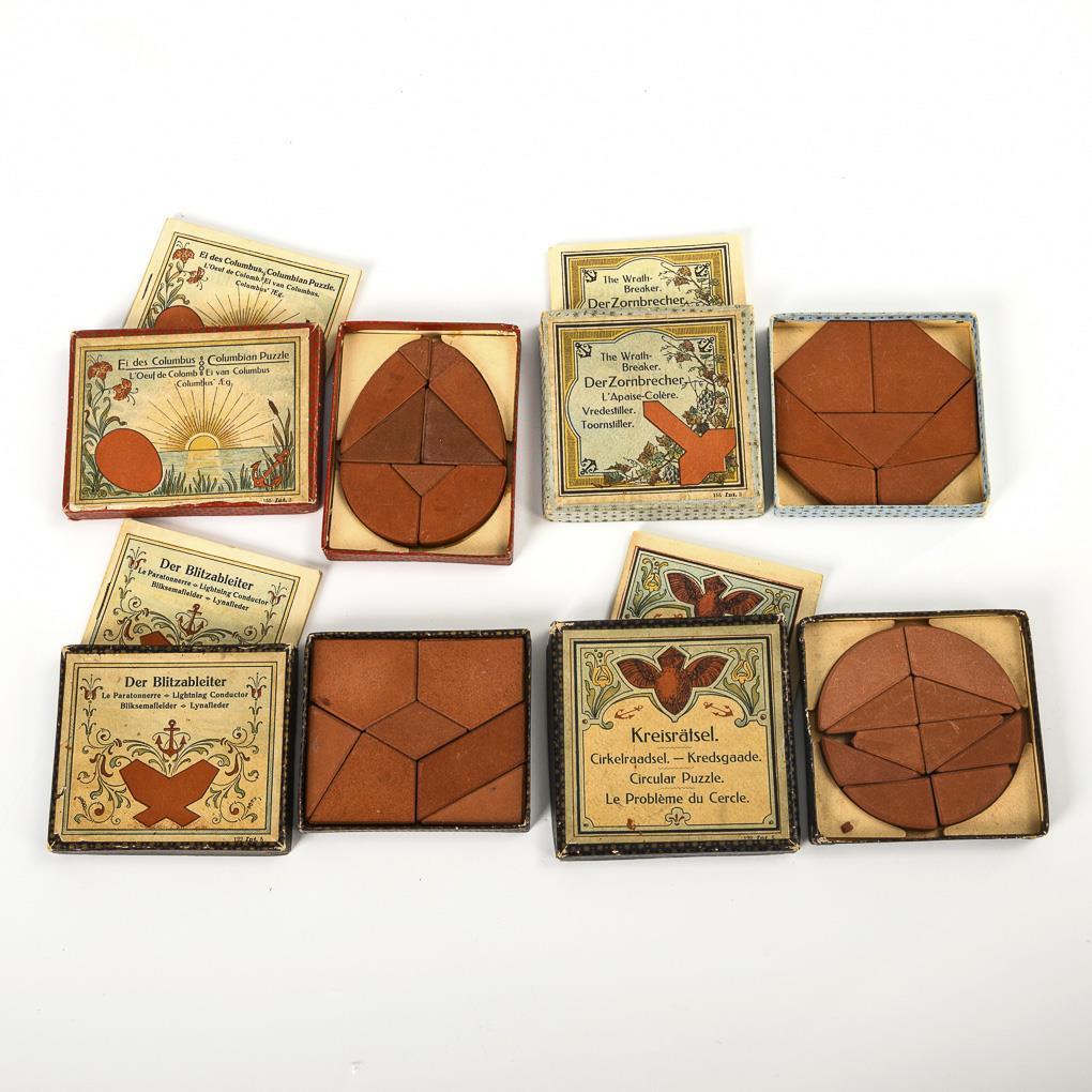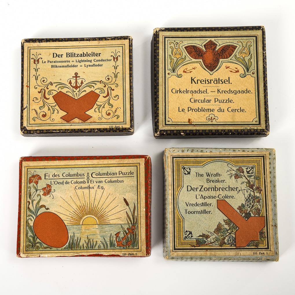 "Circle puzzle". Some stones bumped. 9 x 9 cm. / "The lightning rod". 8 x 9.5 cm. / "The wrathbreaker". 9 x 9 cm. / "Egg of Columbus". 1 stone minimally bumped. 8 x 10.5 cm. All complete, with booklet.