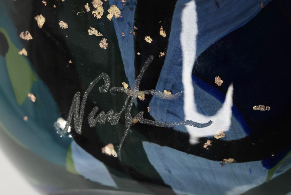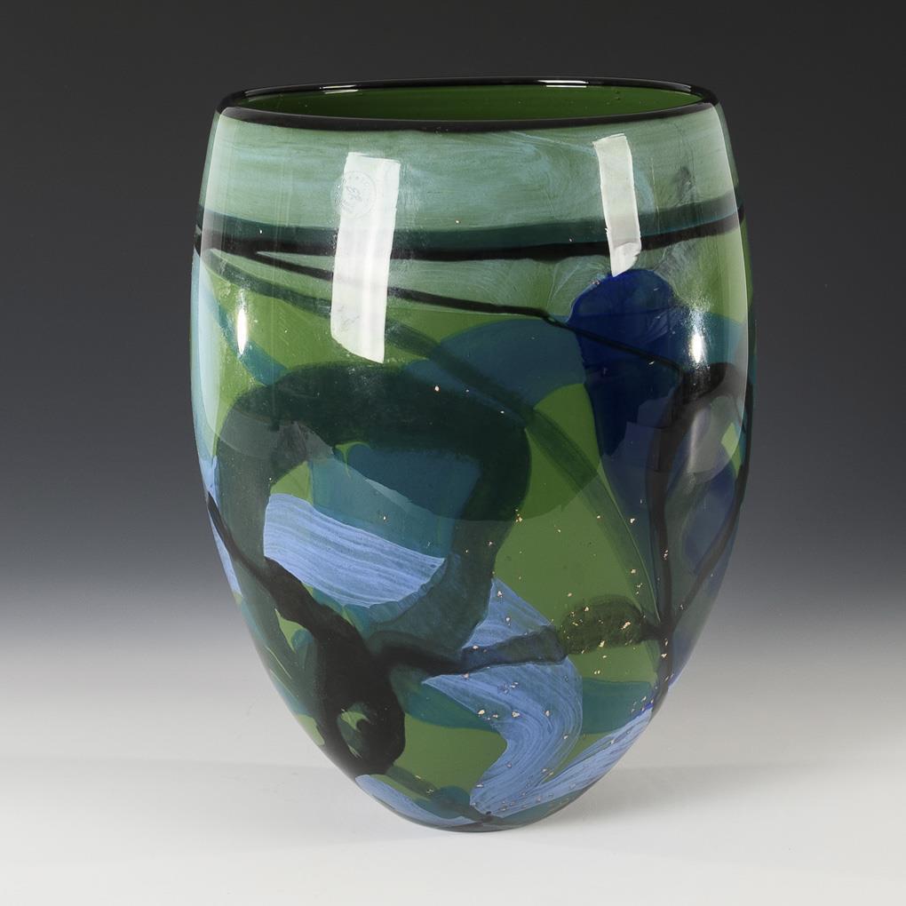 Colorless glass, in the intermediate layer color meltings in green and blue tones as well as blasted gold foil. H 30 cm.