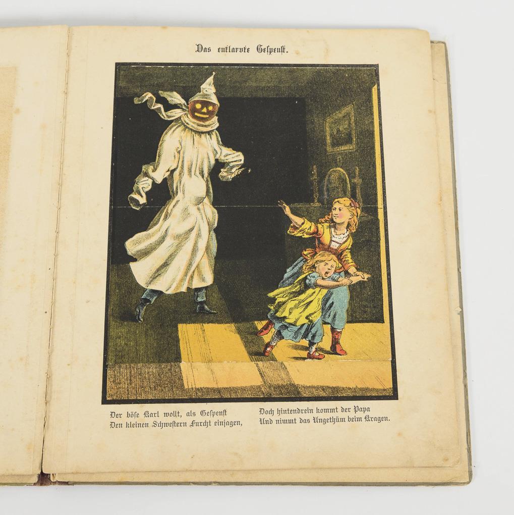"Zur Unterhaltung und Belustigung der heiteren Jugend mit sechs Doppelbildern in lithograph. Color print". Stone drawings by W. v. Breitschwert. Published by J.F. Schreiber, Eßlingen (1875), 2nd edition. Each image as a folding double image showing the consequences of the previous act. Title page and block loose, stronger traces of use.