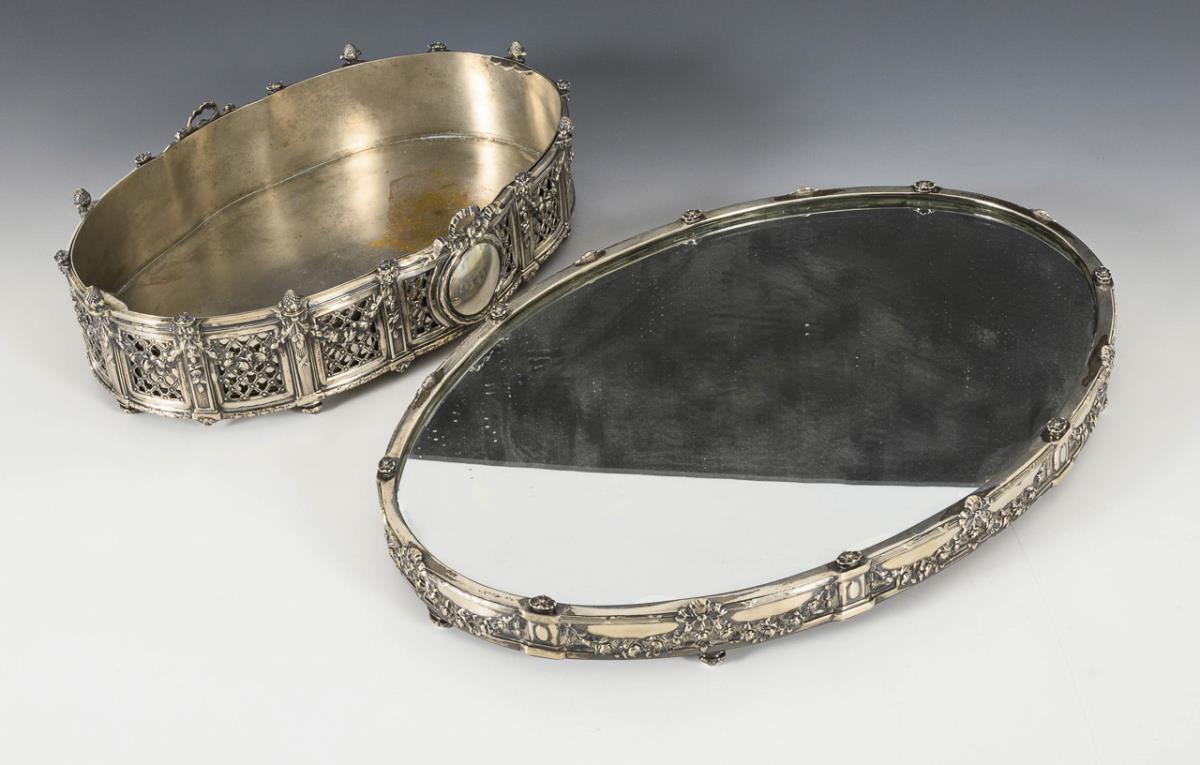 Open-worked silver mount with rose garlands and metal insert. On original base with mirror glass. Some staining in places.
