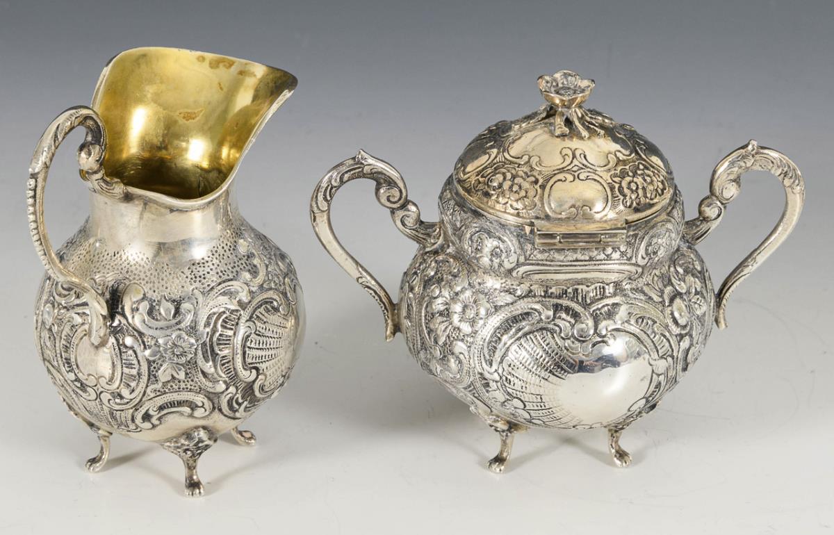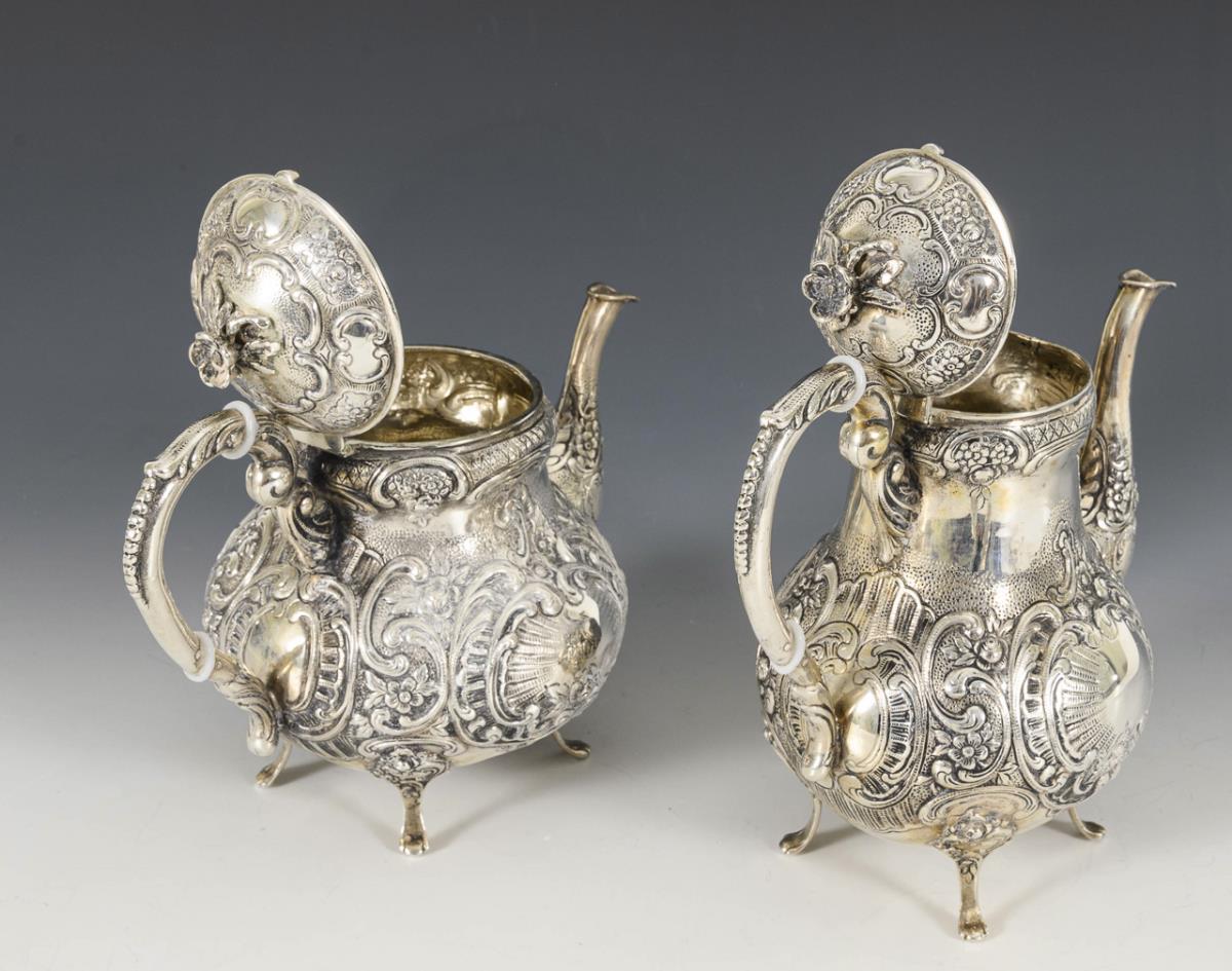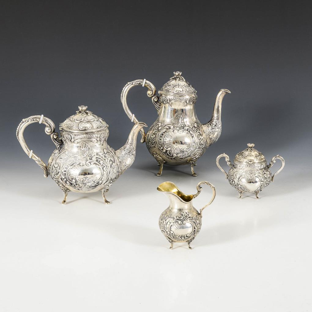 Bellied shape with rocaille and flower reliefs: coffee pot, teapot, sugar bowl and cream jug. Slight signs of wear, small solder marks.