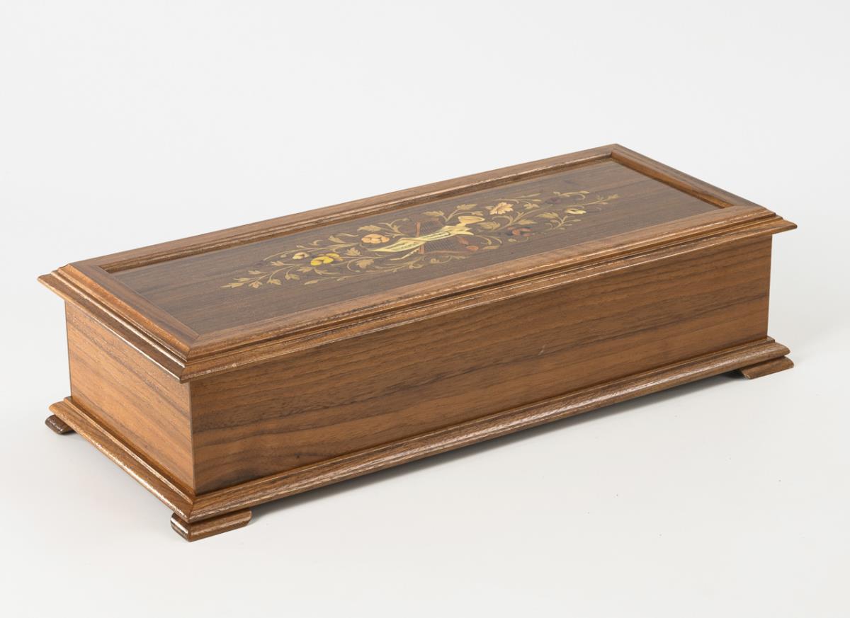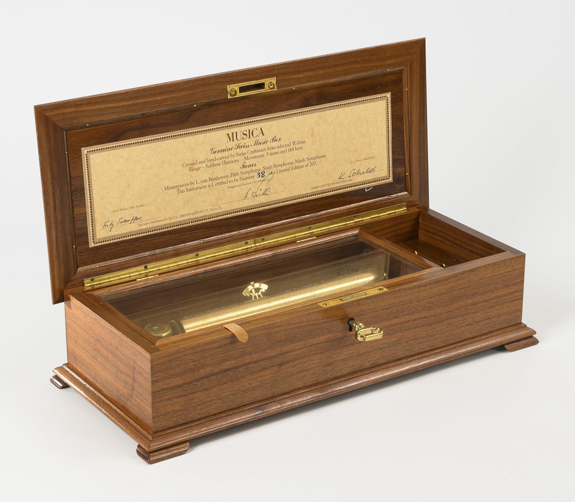 Ashlar box music box, the hinged lid with fine marquetry with instruments and foliate scrolls. Cover label for the limited edition with list of songs (Beethoven 5th, 6th and 9th symphonies) and 3 signatures. Under the glazing, cylinder movement with 2 reed combs and song display. Next to the movement 2 adjusting levers. Plays with a beautiful sound (somewhat slow).