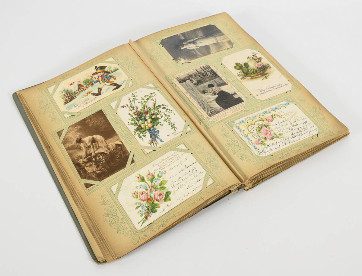 Approx. 320 postcards, kitsch and greeting cards, around 1910/30, in a gold embossed/grey album with poppies "Greetings from afar".