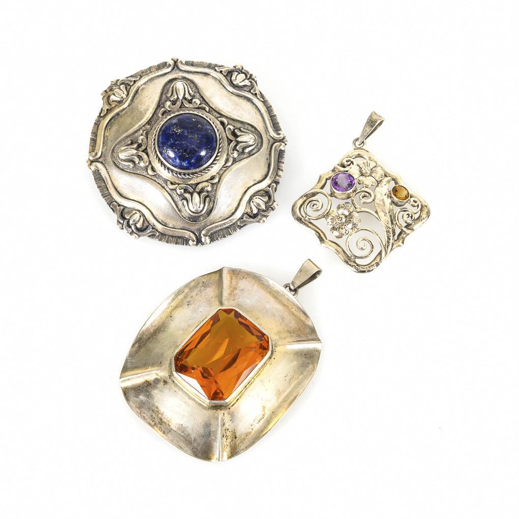 Large, relief brooch with bezel-set lapiscabochon. Wide frame pendant with bezel-set imitation. Floral openwork pendant with amethyst and citrine?. Pendant: yellow imitation with rubbed facetted edges.