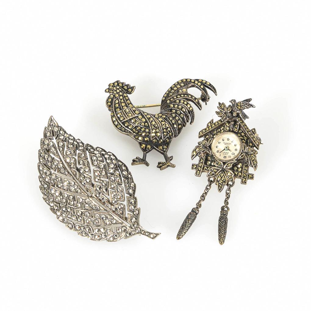 Silver tested, 2x silver 925 stamped. Leaf 5.7 x 3 cm. Clock 5.2 x 2.3 Cock 3.9 x 3.3 cm. 11,2/13,3/9,7 g.