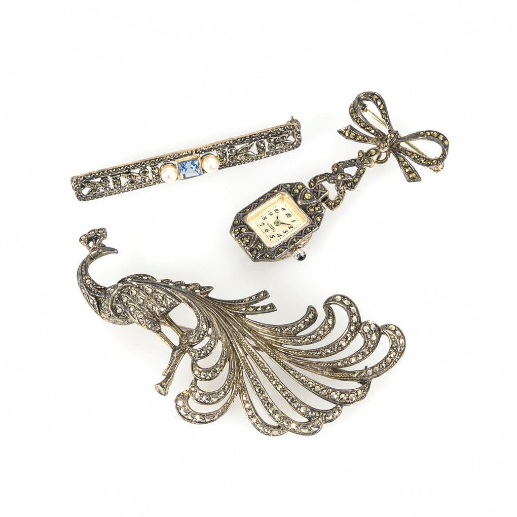 Silver 925 stamped. Peacock 7.5 x 4 cm. Bar brooch 5.5 x 0.8 cm. Clock 5.3 x 2.8 cm. 20,4/4,6/11,5 g.