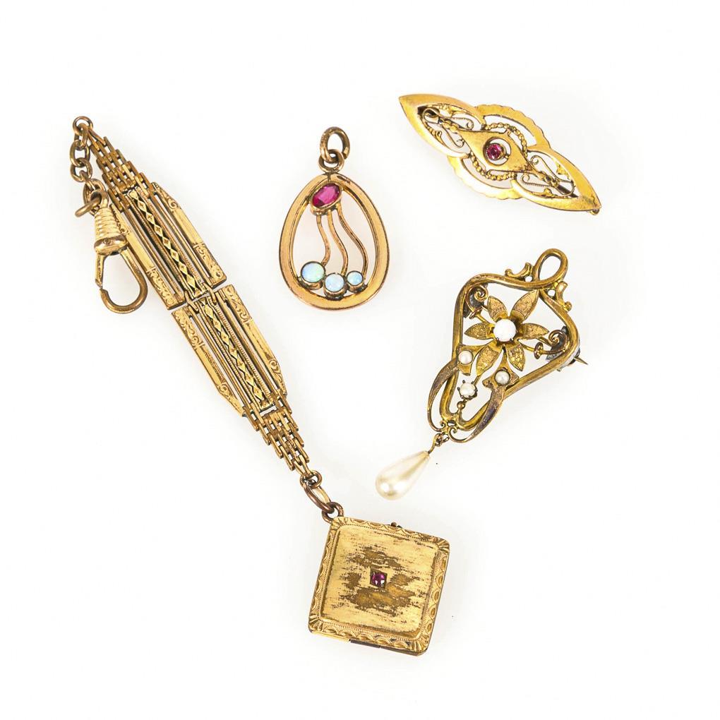 Châtelaine with medallion (2 framed inner compartments), 2 brooches and pendant with opal cabochons, pearls, faux pearl and red imitations. Carabiner, hook clasps.