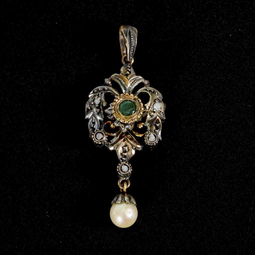 Small ornamental pendant with bezel-set emerald, embedded diamond chips and suspended cultured pearl. Stained.