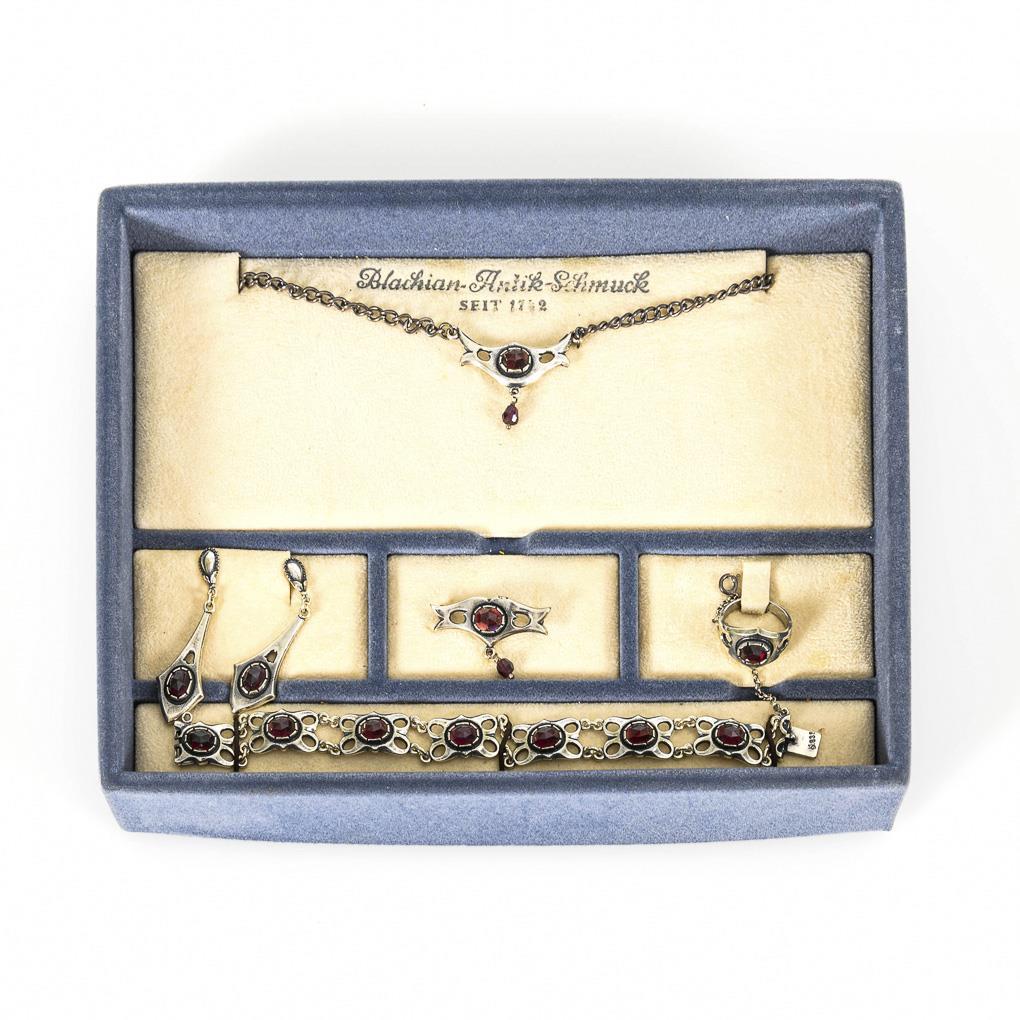 5-piece jewelry set in original "Blachian antique jewelry" display case with garnets.