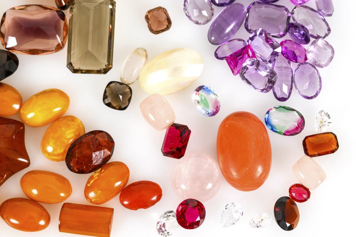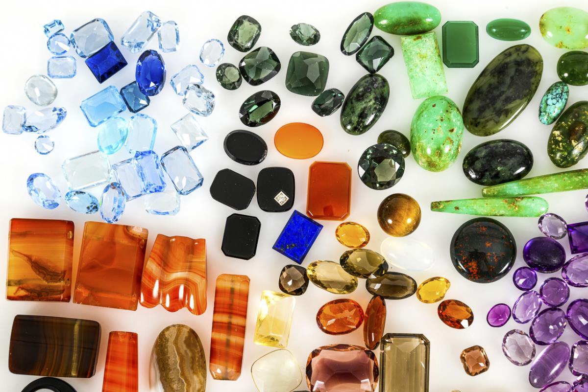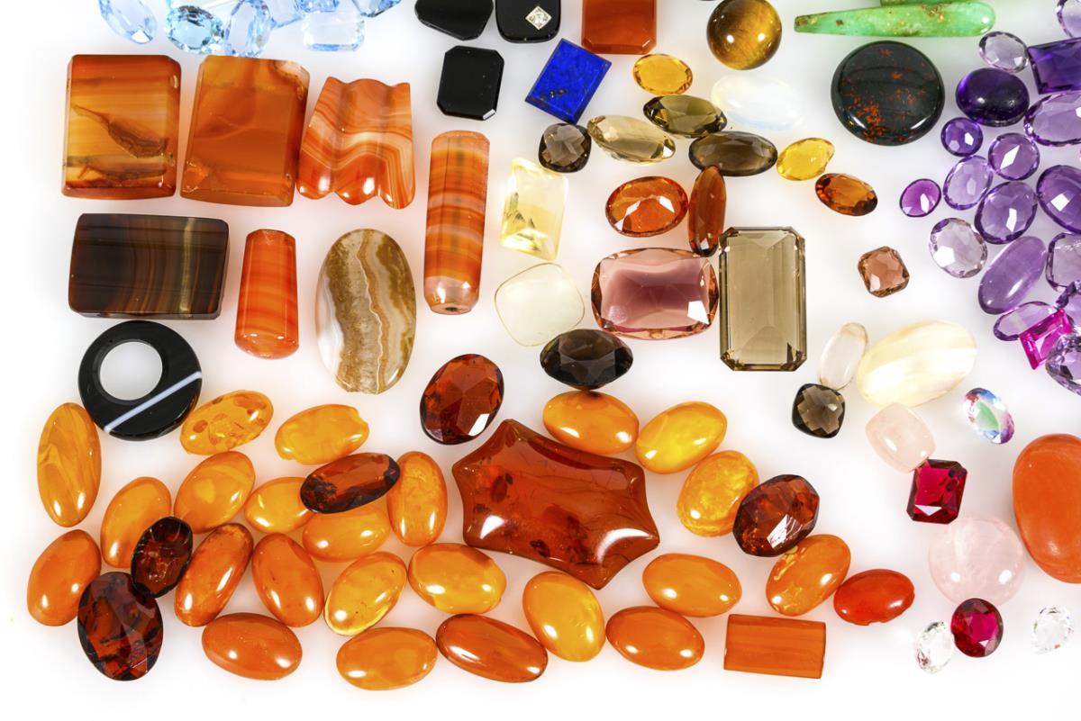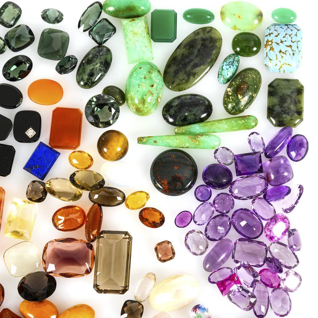 168 different colored stones, syntheses and imitations. Some faceted or cut as cabochons. A few with drill holes. (Including agates, amber, amethysts, 1 tiger's eye sphere, 1 heliotrope, 3 garnets, 3 rose quartz, 2 corals, 1 mother-of-pearl, 2 carnelian tablets, 3 green agates, 3 moss agates, 1 lapis tablet, 4 onyx tablets (1 with small brilliant-cut diamond), smoky quartz, citrine, 2 Rhine pebbles (glass), aquamarine, blue topaz and tourmaline syntheses? Few facet edges rubbed.