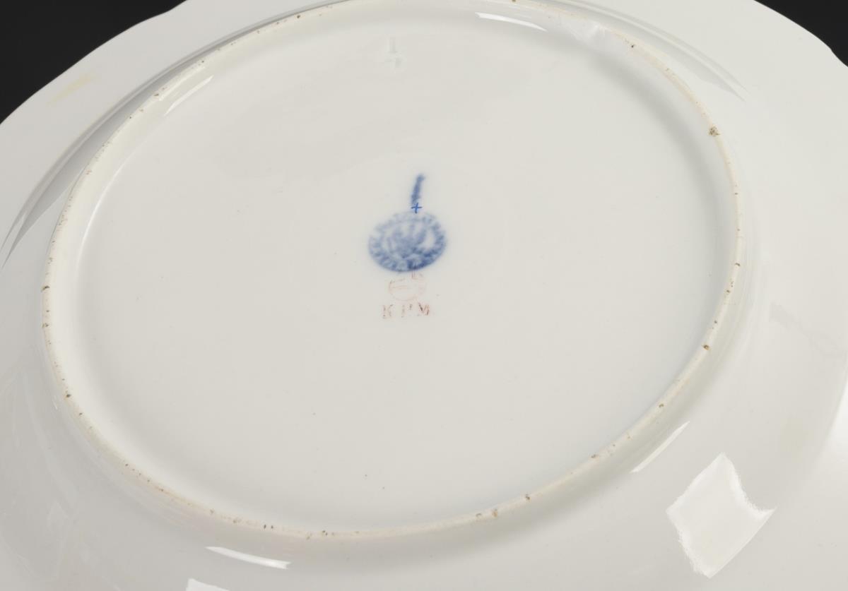 Model "Neuglatt". Breakfast plate with blue rocaille relief and a bouquet of flowers in the mirror. Gold rubbed.