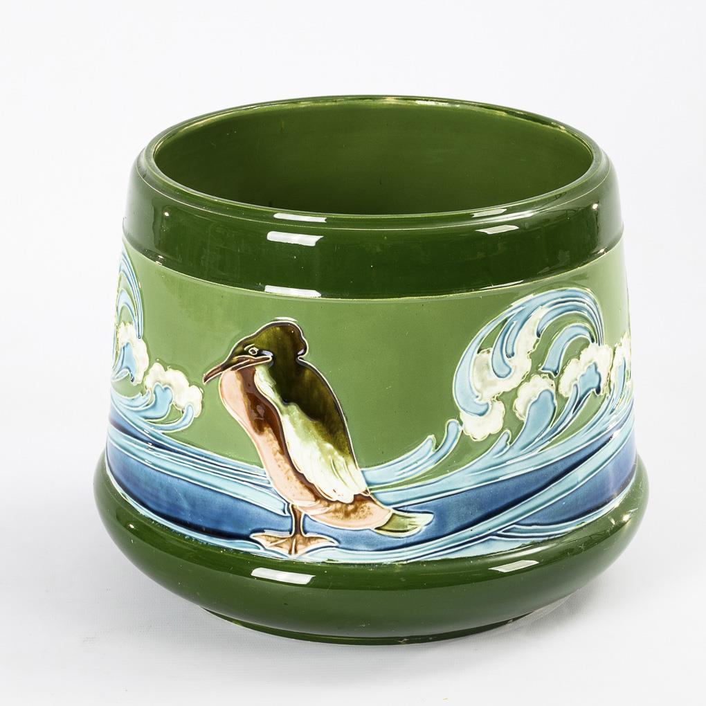 Art Nouveau cachepot with bird motif and ocean waves.