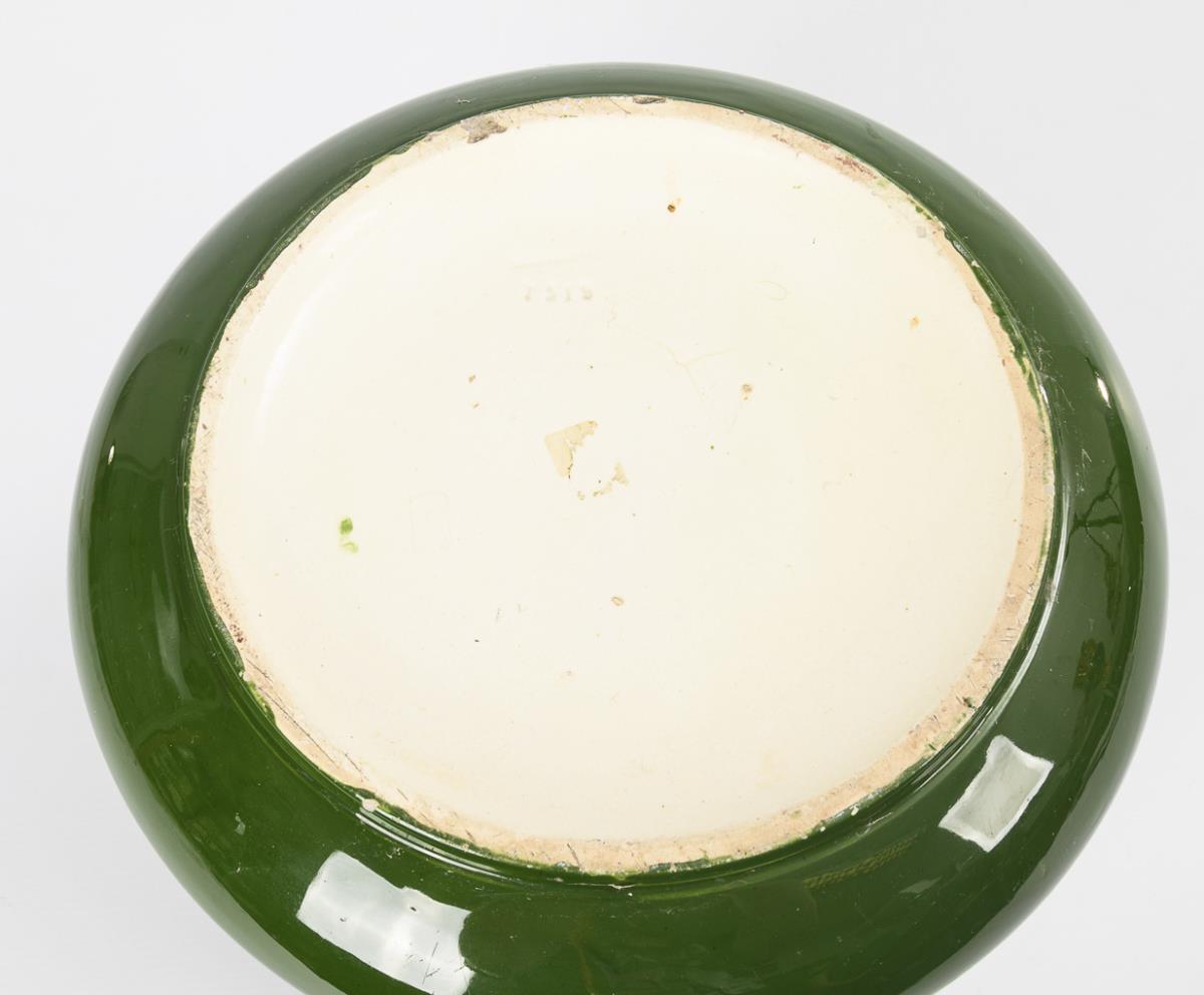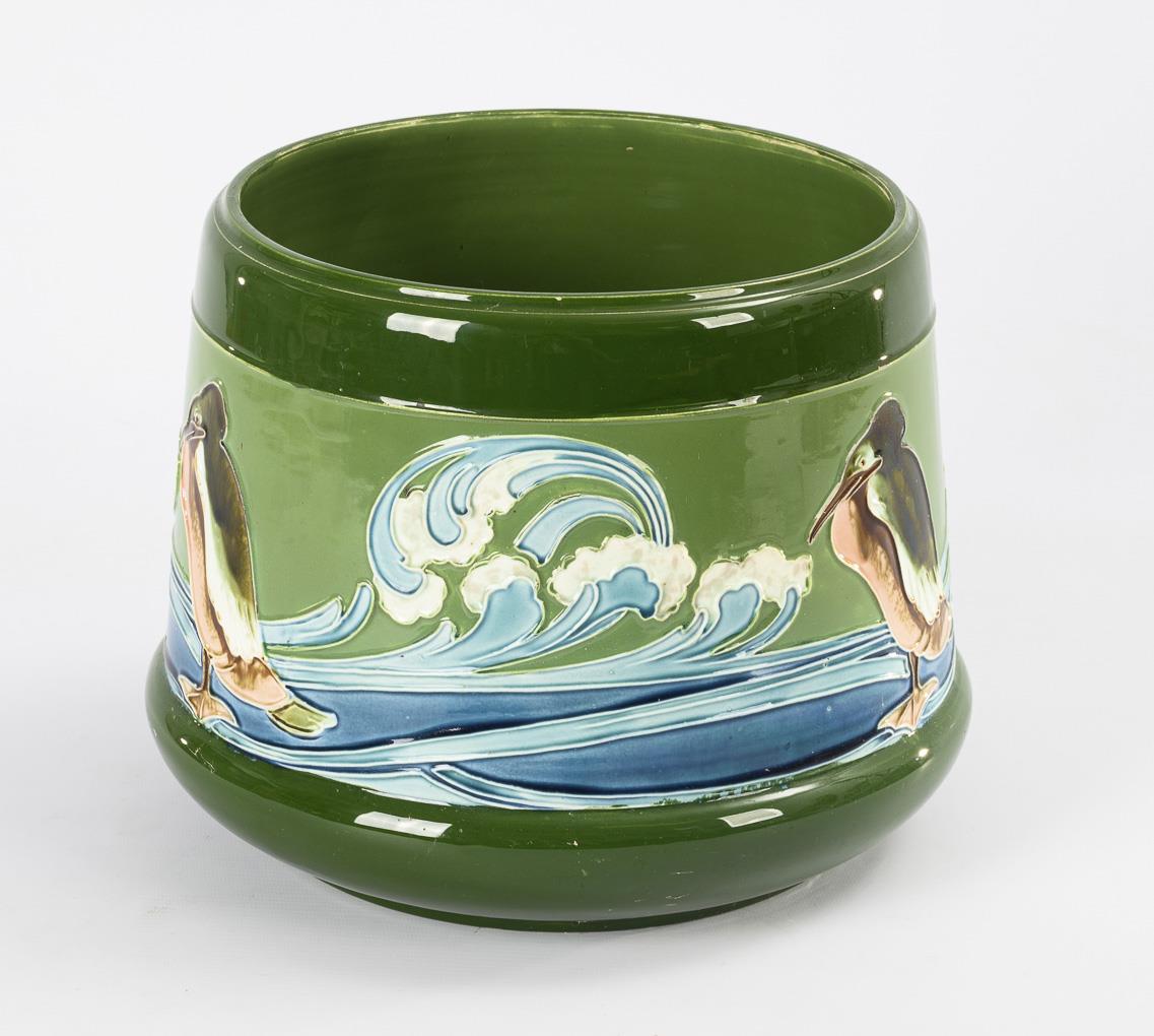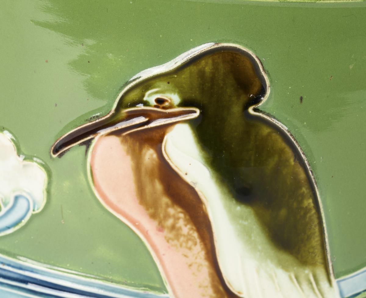 Moss green ground, the wall with a frieze of foaming waves and a stylized pelican. Partially minimally bumped.