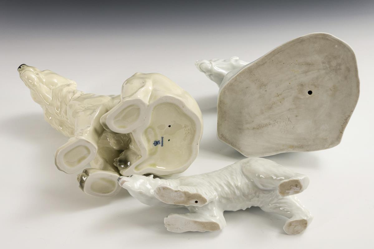 1x HEREND, model no. 5367, design 1927 by Markup Bela (1873-1945): polar bear sitting on an ice floe (h 19 cm). / 1x HEUBACH, model no. 3185, design 1902: polar bear hunting (h 9 cm). / WAGNER & APEL, model no. 430: sitting polar bear (H 23.5 cm).