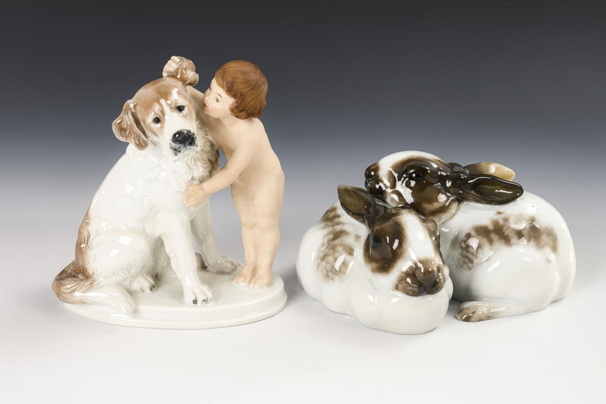 1x model no. 1259, design by Max Daniel Hermann Fritz (1873-1948): Child with St. Bernard (H 16.5 cm). / 1x model no. 612, design 1922 by Ratleff: pair of rabbits nestling together (H 9 cm).