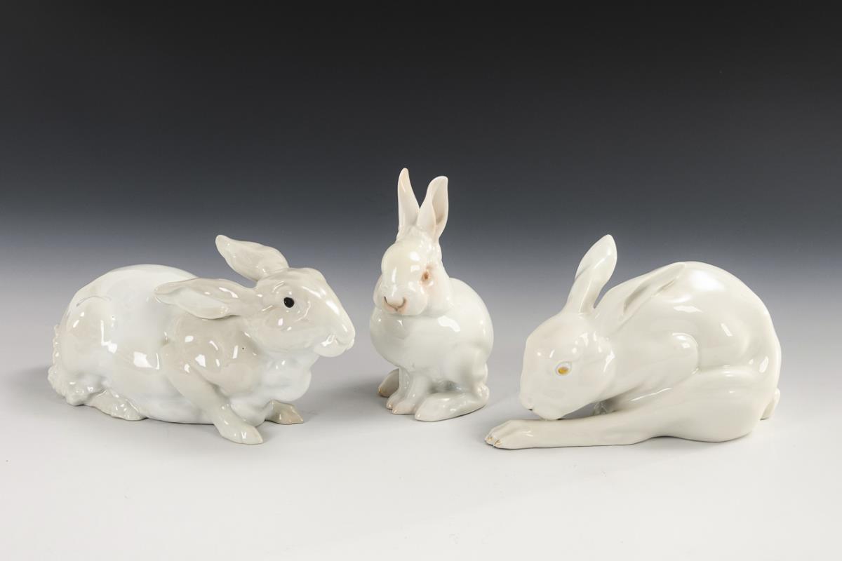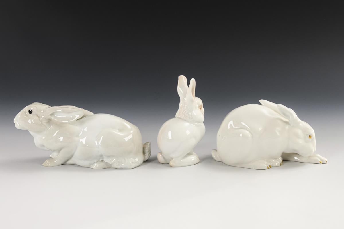 1x ENS, around 1900, model no. 785: seated hare (l 20.5 cm). / 1x HUTSCHENREUTHER, c. 1925: seated hare cleaning its left hind leg (l 17.5 cm). / 1x ROSENTHAL, 1921/22, model no. 86, design by Theodor Kärner (1884-1966): seated, young hare (H 13 cm). Right ear of the cleaning hare restored.