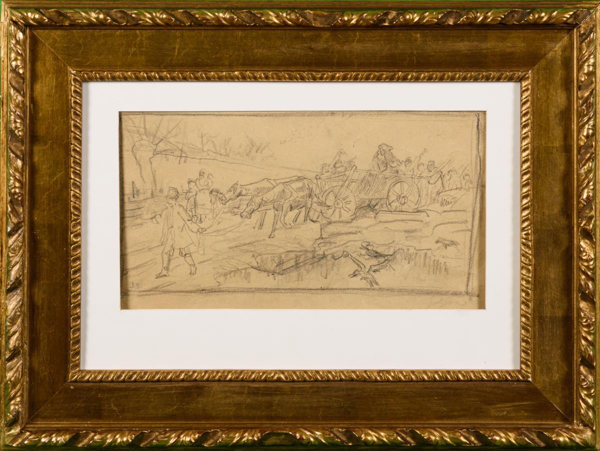 Zeichnung mit Pferdekarren und Bauernvolk
