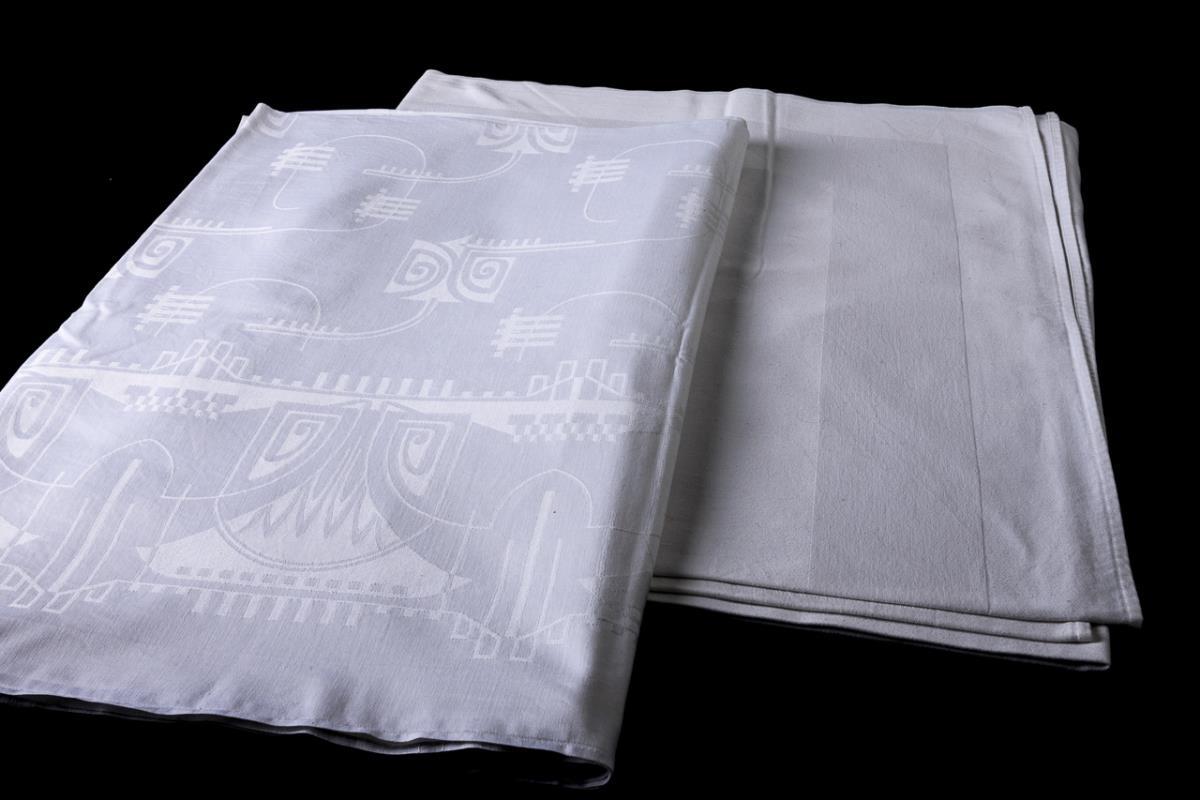 Cloth with decorations typical of the style and plain cloth with wide stripes. Tablecloth: 2 small stains. Tablecloth: scattered stains, yellowed, signs of wear.