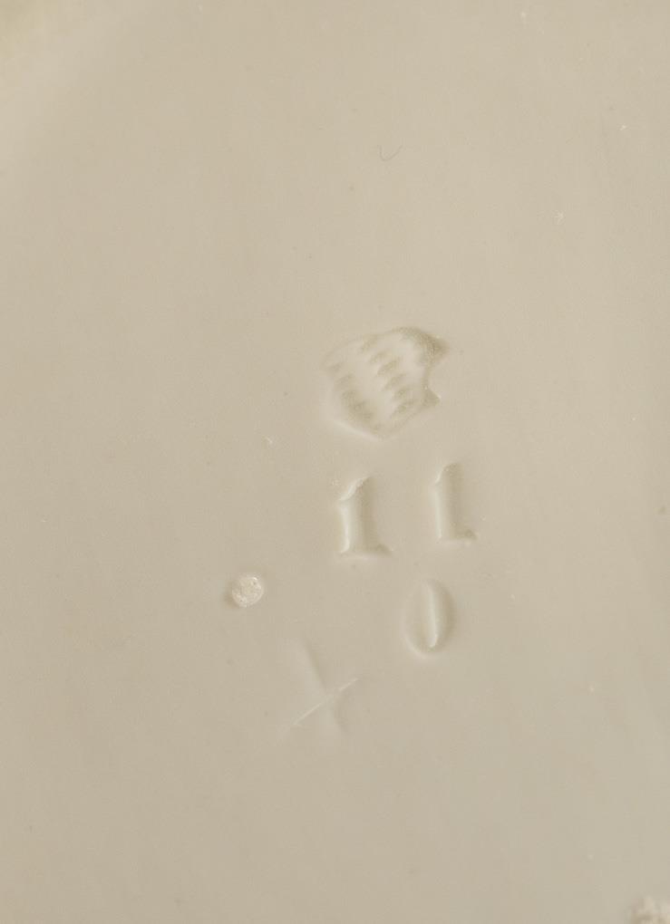 Lady on a rocaille plinth, her left hand raised in defense. Bump to the edge of the plinth.