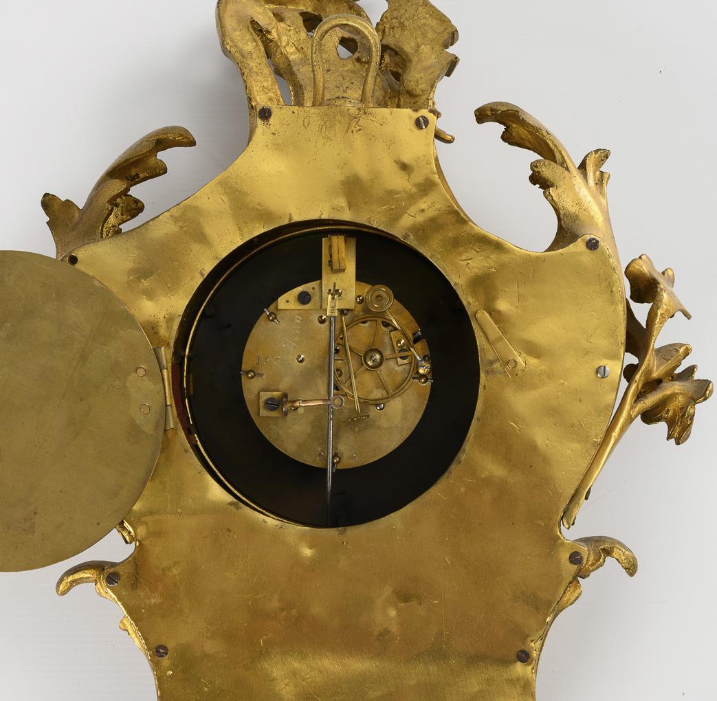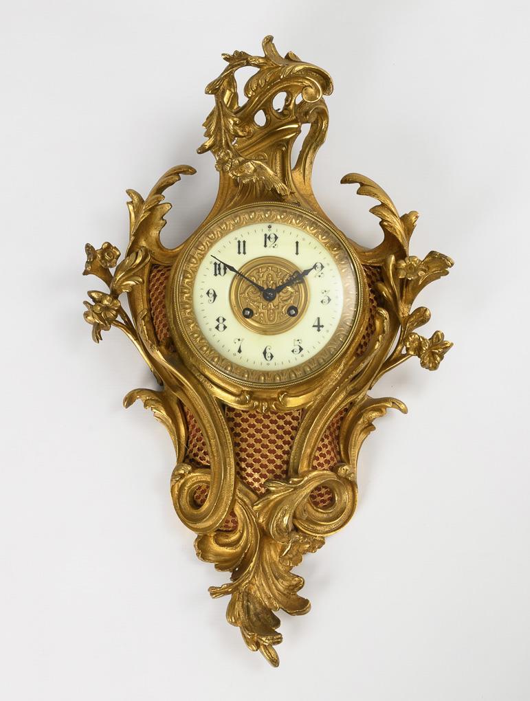 Rocaillé wall clock with foliage and flowers, partly pierced, latticework underlaid with red felt fabric. Slight signs of age and wear, clock face minimally hairline cracked, lower foliage glued.