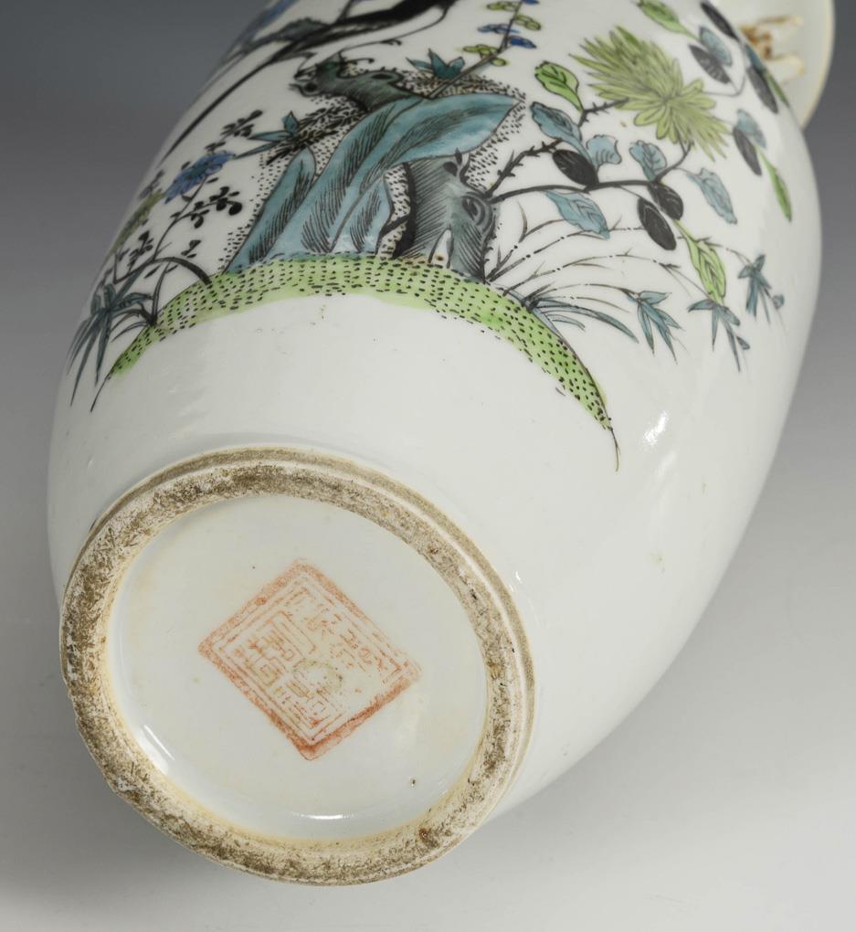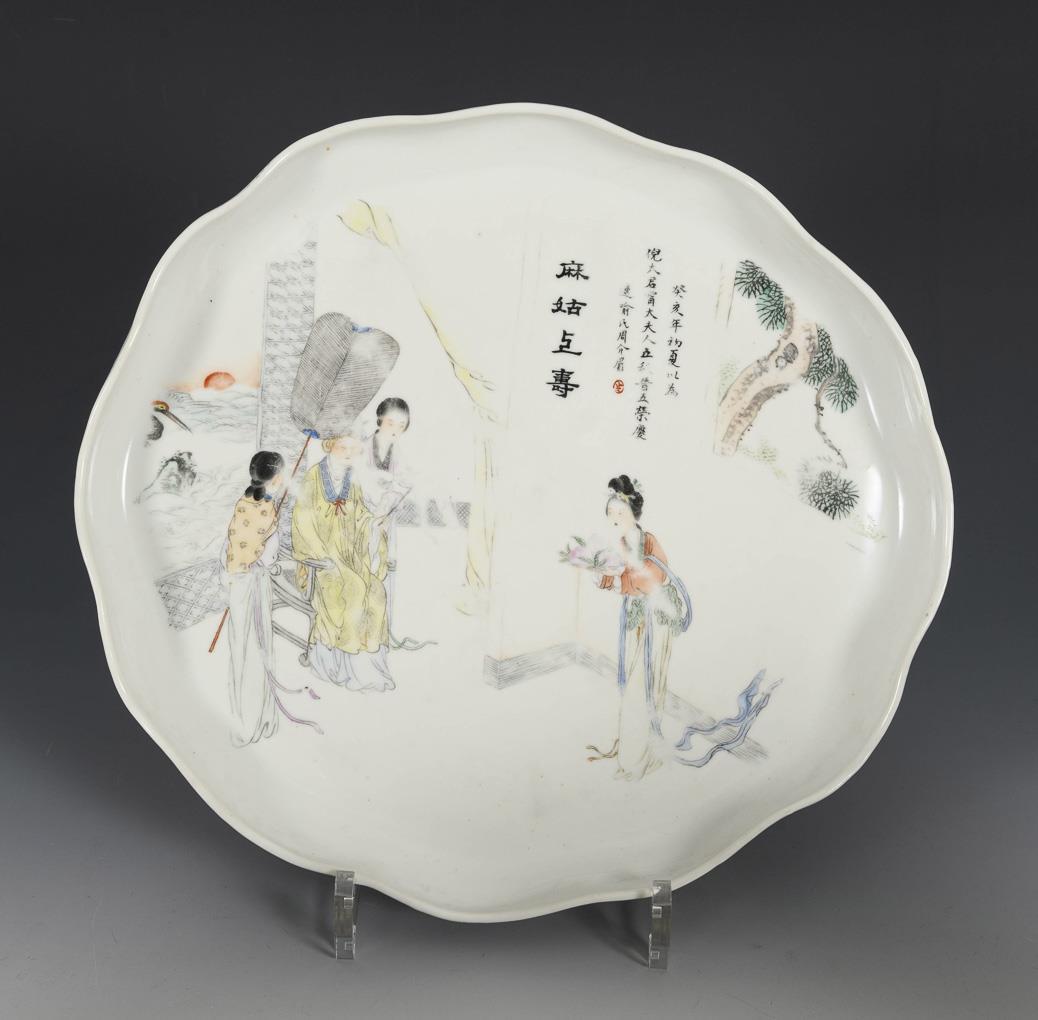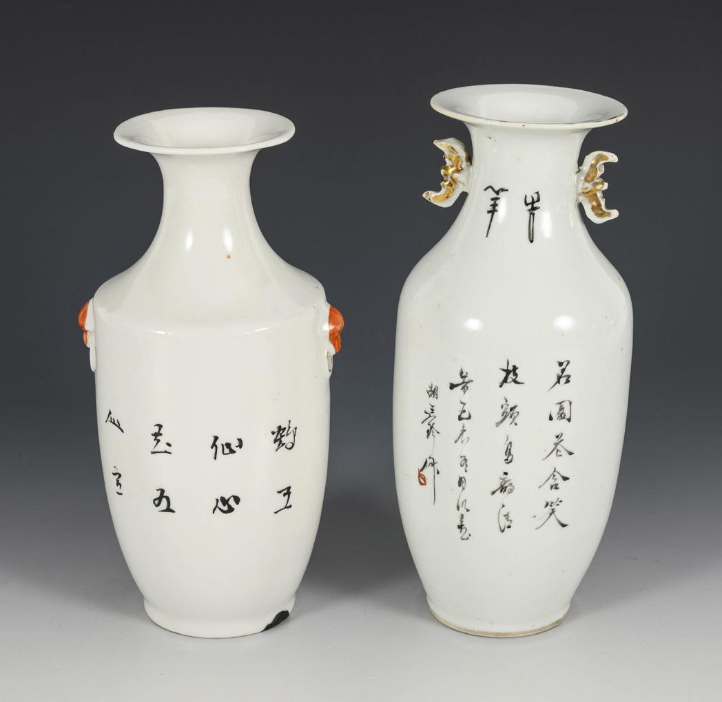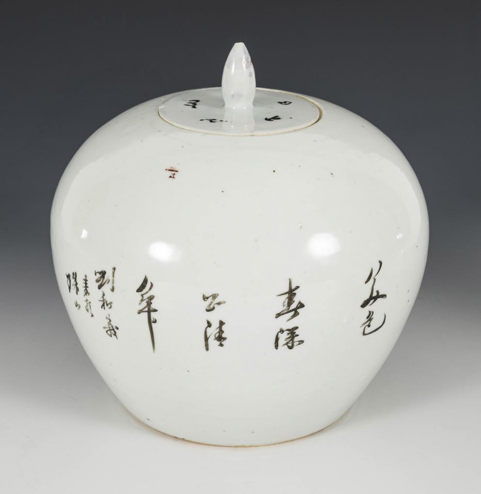 Small baluster vases with depictions of cranes and magpies. Box with three women in a garden, chip on lid knob / Plate with curved rim. Lady with servants being brought three peaches. All with blocks of writing. A vase with old chip on the neck.