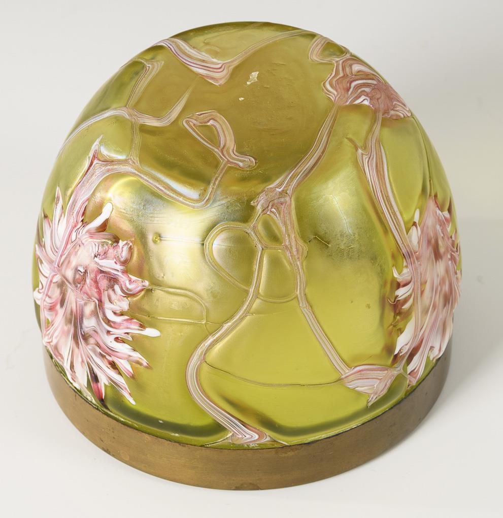 Light green glass, woven with colourless, pink and opal white marbled threads and stylized flower decoration of red-opal white marbled glass mass, iridescent. H 7 cm, Ø 9.5 cm.