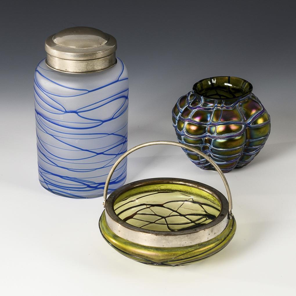 1x cylindrical tea caddy made of colorless, frosted glass with blue thread net and metal mounting (H 15 cm). / 1x ELISABETH: six-pass baluster vase made of green glass with blue thread net, iridescent (H 8 cm). / 1x flat bowl made of green glass with red thread net and metal mounting (Ø 12 cm).