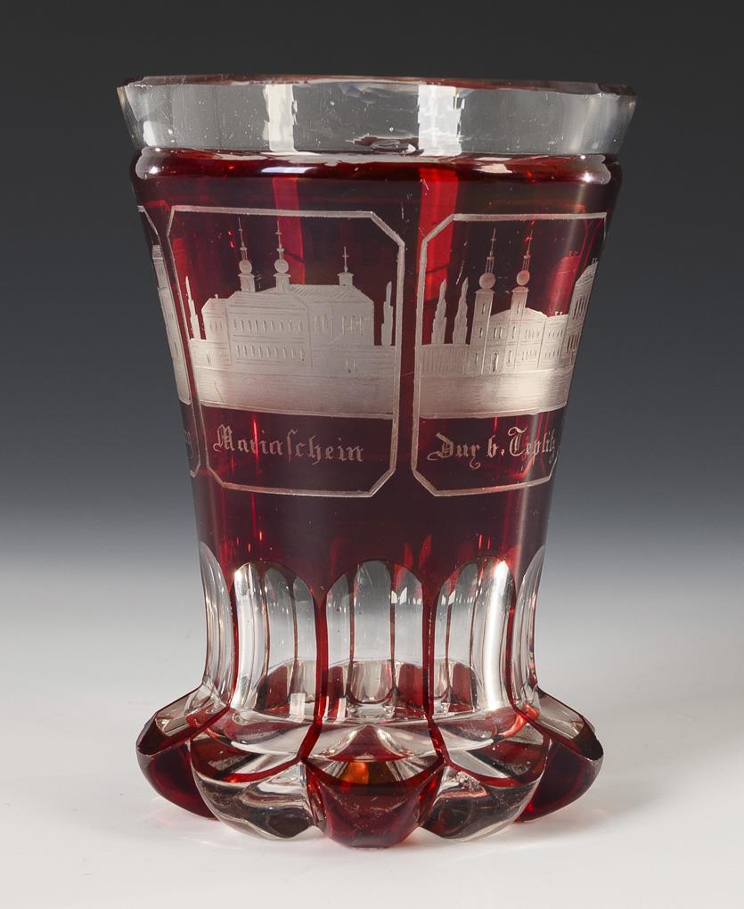 2x Teplice: red stained ranf cup and yellow stained ranf cup with engraved and inscribed views of Teplice (h 14 and 11.5 cm). / 1x small, red-stained Ranft beaker with engraved and inscribed views of Saxon Switzerland (h 10 cm). 1x wear to the rim of the mouth and chips to the foot rim.