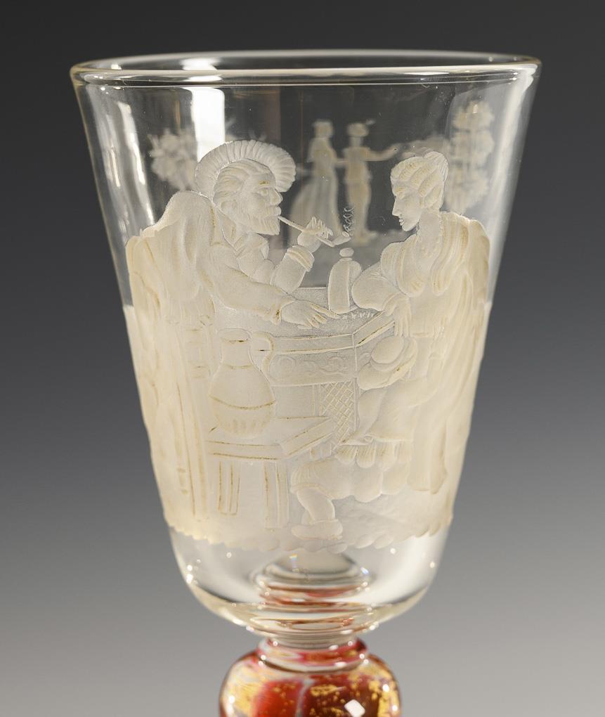 Conical dome of colorless glass, lid with pointed knob and nodded baluster stem with spirally melted red threads and melted, blasted gold foil, round foot with turned rim. Engraved genre scenes on the bowl.