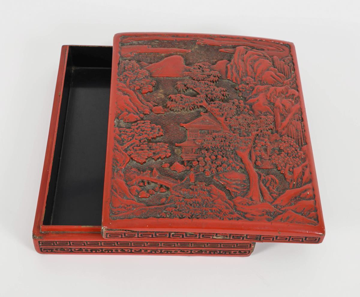 Rectangular body with idealized seascape, surrounded by mountains and trees. Meander ornament around the sides. Painted black inside. Minor defects due to age.