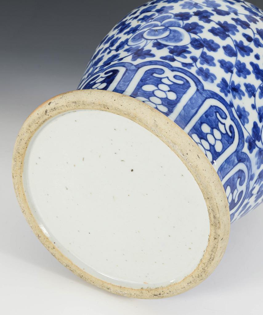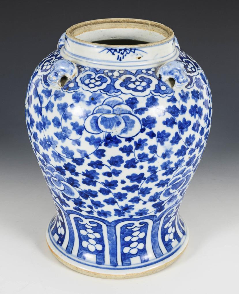 Baluster vase with tendril motif and four lion heads at the shoulder base as eyelets for closure.